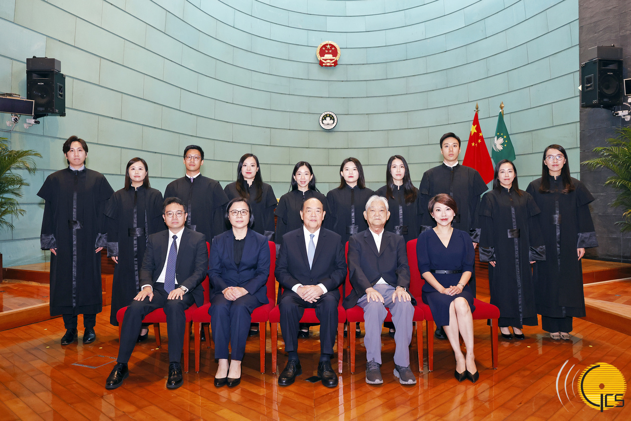 • The Chief Executive, Mr Ho Iat Seng, Acting President of the Court of Final Appeal, Ms Song Man Lei, and the Chairman of the Independent Commission on the Recommendation of Judges, Mr Lau Cheok Va, pose for a photograph with newly inaugurated judges of the Court of First Instance.