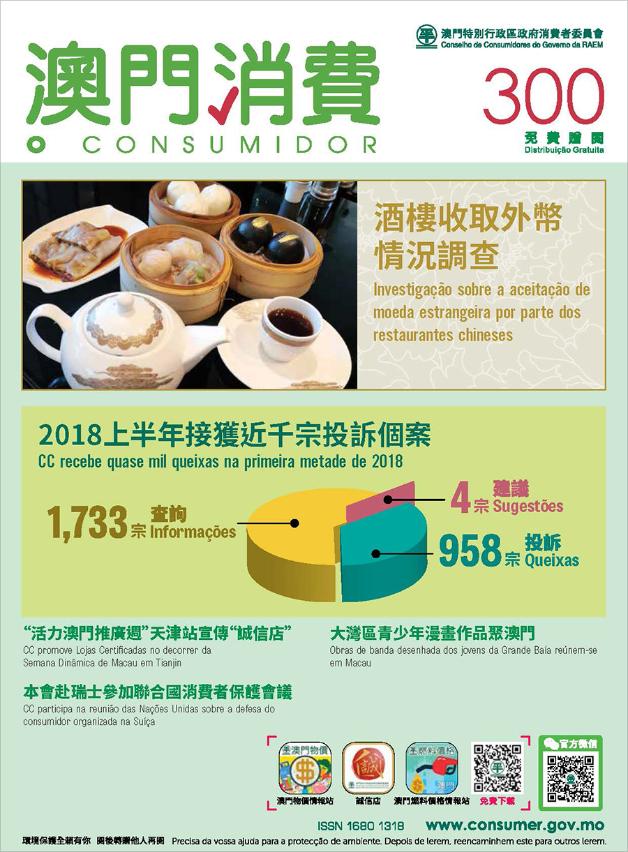 The Consumer Council published its latest issue no. 300 Consumer Report, featuring a survey report on how Chinese restaurants handle consumers paying with foreign currencies, a report on the cases received by the Council in the first half year of 2018 is also included.