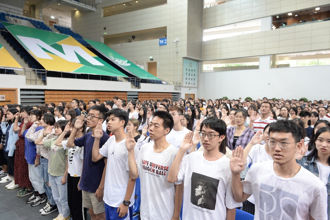 Macao Polytechnic Institute held the opening ceremony for academic year 2019/2020 in MPI Multi-sport Pavilion on 20 August at 3:00 p.m. The ceremony carried forward the tradition of loving the country and Macao by hoisting the national flag and playing and singing the national anthem. This academic year, MPI inducted 1000 freshmen of Bachelor’s Degree programmes, Master’s Degree programmes and Ph.D. programmes, from Macao and other parts of the Greater Bay Area and from Portuguese-speaking countries; and more than 500 excellent students were awarded scholarships at the ceremony. Over 2000 participants, including community leaders, representatives of scholarship sponsors, representatives from universities at home and abroad, and MPI staff and students, attended the ceremony and stood as witnesses for the freshmen to be sworn into the MPI family with their oath of “MPI heart, our new start”, in a lively and touching atmosphere.