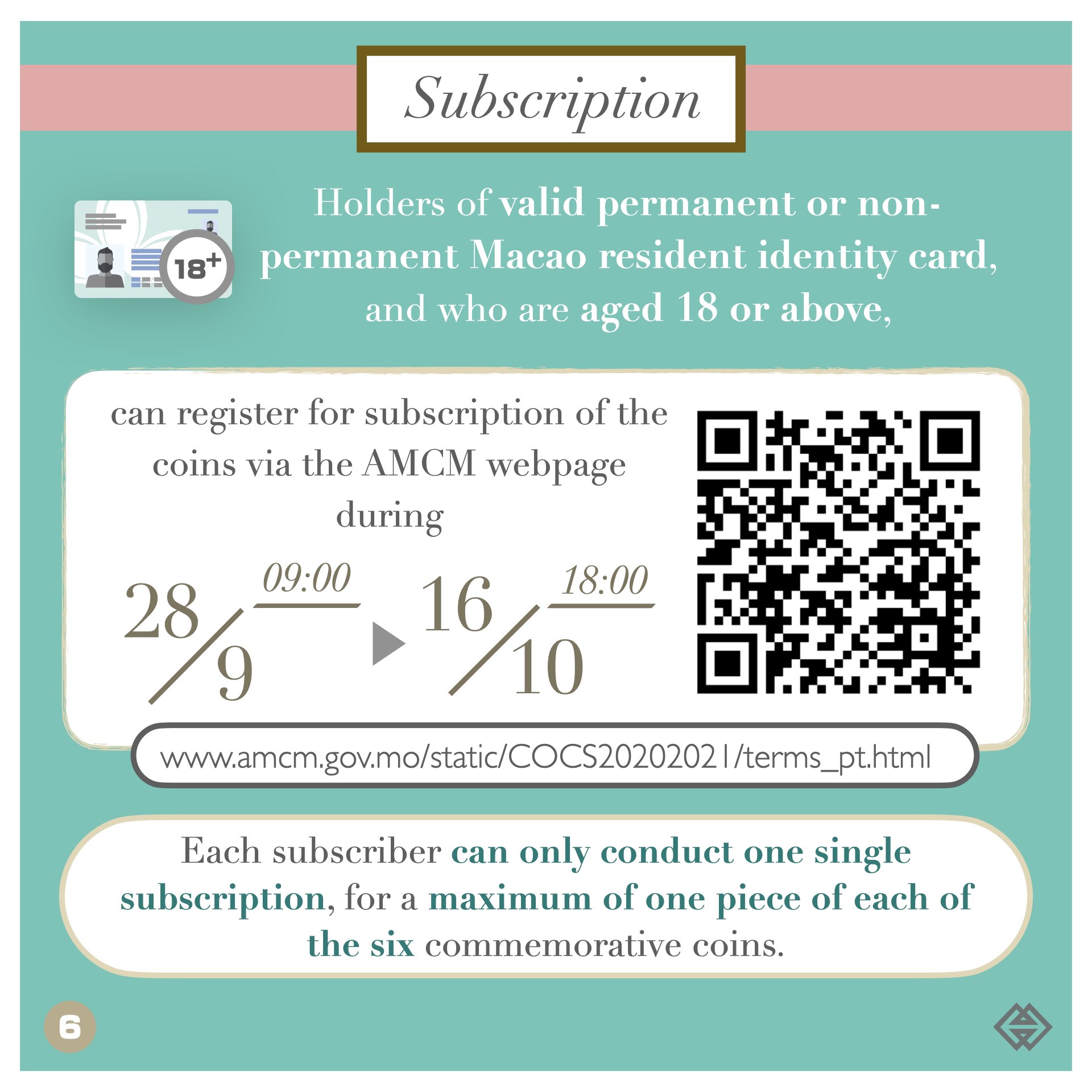 Holders of either permanent or non-permanent valid Macao resident identity card, and who are aged 18 or above, can register for subscription of the coins via AMCM webpage ( https://www.amcm.gov.mo/static/COCS20202021/terms_pt.html ) from 9:00am on 28 September until 6:00pm on 16 October 2020. Simultaneously, a service counter will be set up at the lobby of AMCM within the mentioned time period to provide registration service for those elderly citizens who require assistance.