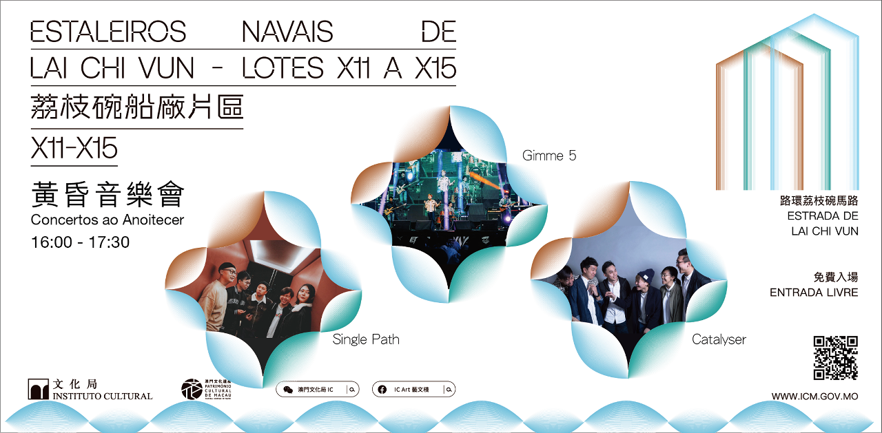 In order to promote public appreciation and participation in culture and arts, as well as to build more performance platforms for local artistic and cultural practitioners, the Cultural Affairs Bureau (IC, from the Portuguese acronym) will hold evening concerts at Lai Chi Vun Shipyards - Plots X11-X15 in the second half of each month, between July and November, gathering musicians from various regions and different languages to present a variety of music performances in multiple music genres and promote exchanges.
