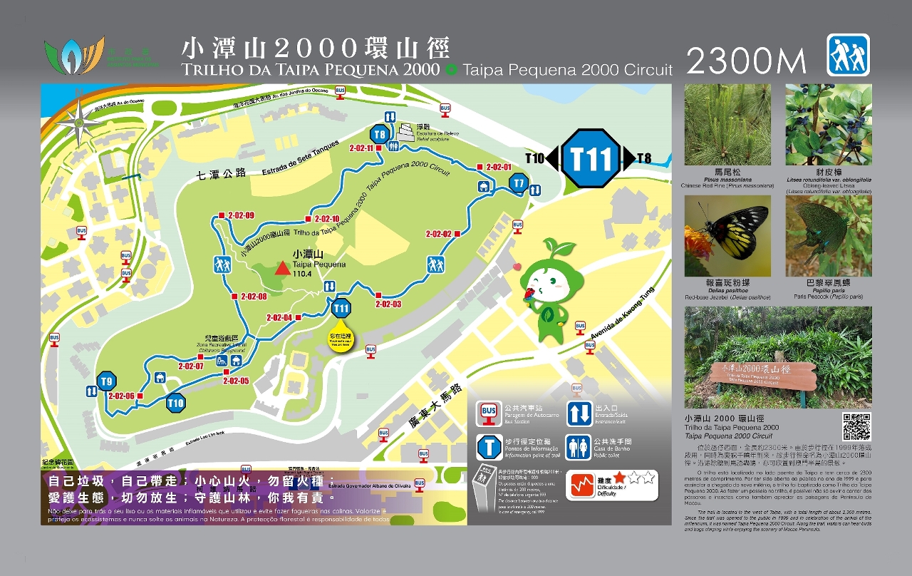 About 100 popular science informative signs were added and optimised this year in 7 trails and 19 parks, including Hac Sá Reservoir Family Trail, Hac Sá Reservoir Fitness Trail, Hac Sá Long Chao Kok Coastal Trail, Morro de Hac Sá Family Trail, Taipa Pequena 2000 Circuit, Central da Taipa Park, Flower City Park, etc. The contents of the informative signs include the maps of the parks and trails, knowledge about the flora and fauna, information about mountain forest restoration, tips for hiking, etc., so that the public and tourists can better understand the greening condition in Macao and their user experience can be improved when they use the facilities.