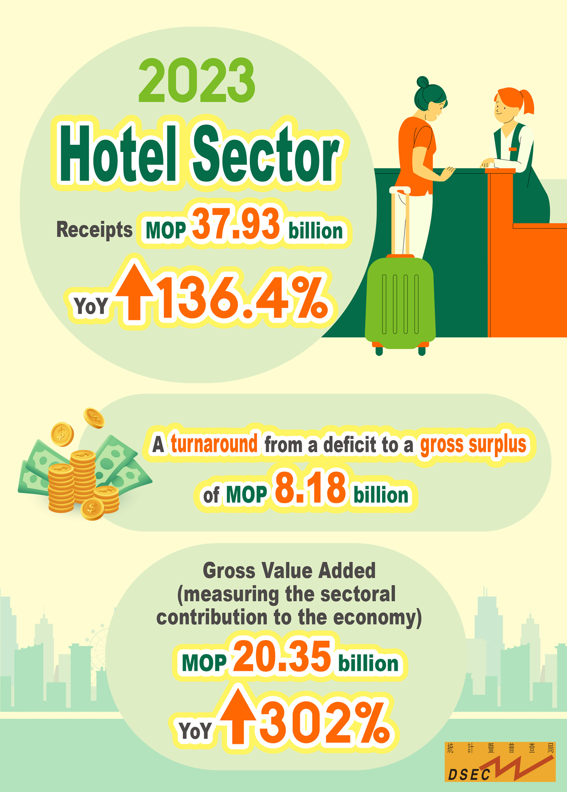 Information from the Statistics and Census Service (DSEC) indicated that a total of 145 hotel establishments (including hotels and economical accommodation establishments) were operating in 2023, an increase of 12 year-on-year; total number of persons engaged grew by 27.8% to 45,704. With a rebound in the occupancy rate of guest rooms on the back of a surge in the number of guests, receipts of the hotel sector soared by 136.4% year-on-year to MOP37.93 billion. Besides, expenditure (excluding depreciation and interest paid) totalled MOP29.84 billion, up by 41.1% year-on-year. The hotel sector recorded a Gross Surplus of MOP8.18 billion in 2023, marking a turnaround from a deficit in the previous year. Gross Value Added that measures the sectoral contribution to the economy stood at MOP20.35 billion, an uplift of 302% year-on-year.