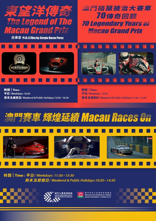 “Macau Races On” will be screened at the Macao Grand Prix Museum starting from 13 November, at two timeslots (11:30 and 15:30) daily from Monday to Friday (except Tuesdays, when the Museum is closed) and twice (10:30 and 14:30) daily on weekends and festive holidays. “The Legend of the Macau Grand Prix” and “70 Legendary Years of Macau Grand Prix” are continuously shown at different timeslots. Museum visitors are welcome to enjoy the films.