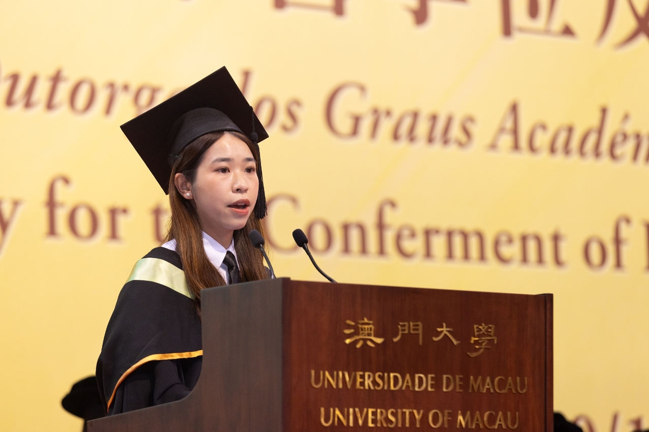 In her speech, graduate representative Lei Pui Ian said that her time at UM has given her not only knowledge, but also resilience, compassion, and the courage to dream beyond boundaries. These lessons, she noted, will guide graduates as they step into an increasingly complex and ever‑changing world. With the foundation they have built at UM, the graduates are prepared not only to adapt, but also to lead. Lei concluded by encouraging her fellow graduates to move forward with courage, gratitude, and determination, to keep learning, and to use what they have learned to make a meaningful difference.