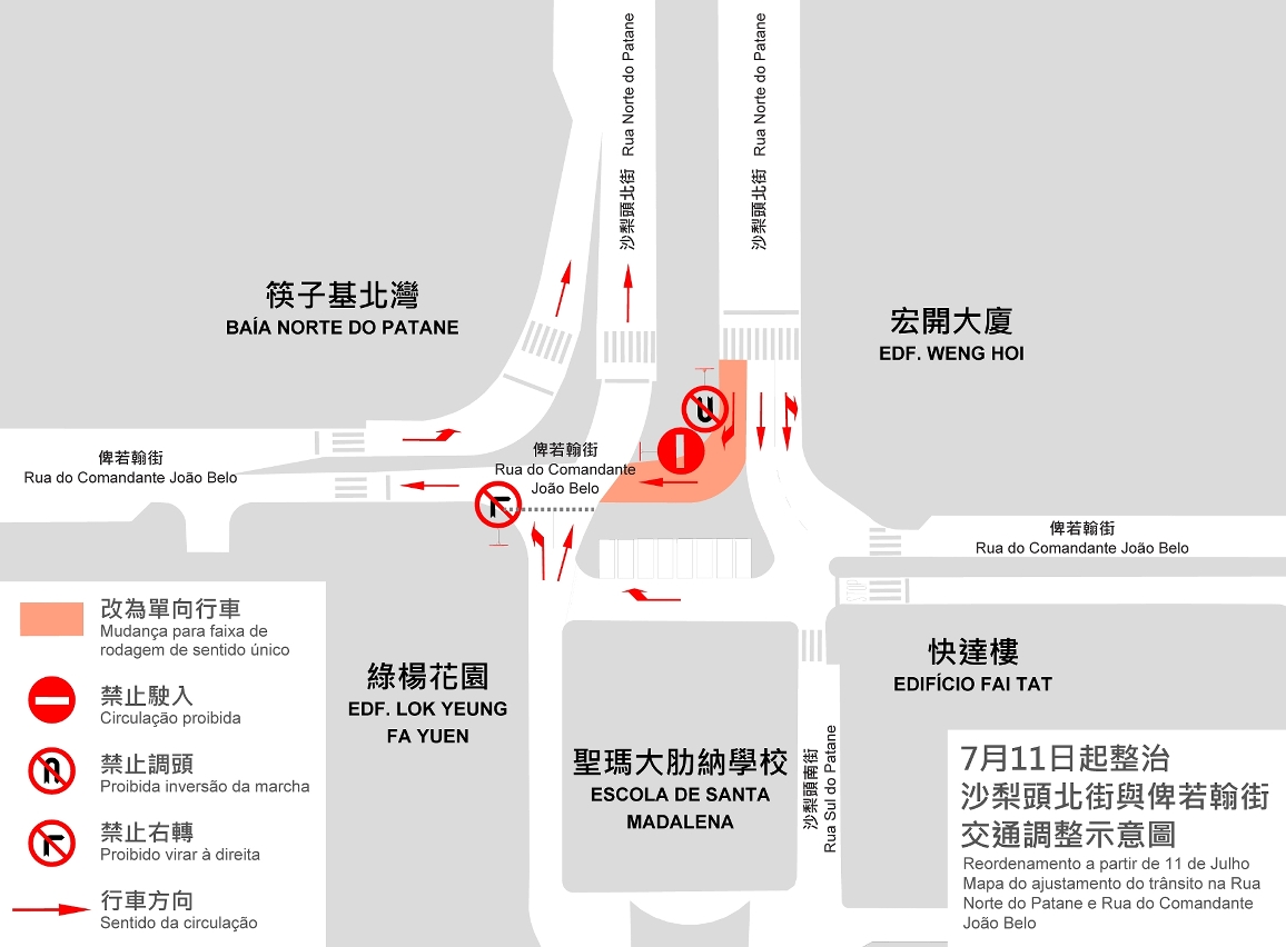 Apresentamos as disposições de melhoria do trânsito: a passadeira junto ao Edifício Lok Yeung Fa Yuen foi desviada para a Rua da Doca Seca; foram criados separadores nas passadeiras desta última referida e da Rua Norte do Patane; foram cancelados oito lugares de estacionamento junto à Escola de Santa Madalena e dois lugares situados na Rua do Comandante João Belo junto à baía, permitindo ampliar as faixas de rodagem e facilitar as manobras dos veículos; na última intersecção mencionada só é permitida a viragem para o lado esquerdo em sentido à Rua Norte do Patane para os veículos oriundos da Rua do Comandante João Belo em sentido leste, e proíbe-se a circulação em sentido ao Canídromo, assim como fica proibida a inversão do sentido de marcha, de forma a simplificar a circulação dessa intersecção. Os condutores poderão efectuar a inversão do sentido na Rua Norte do Patane ou na Rua da Baía do Sul em sentido ao Canídromo, outra alternativa, é na Rua Sul do Patane.