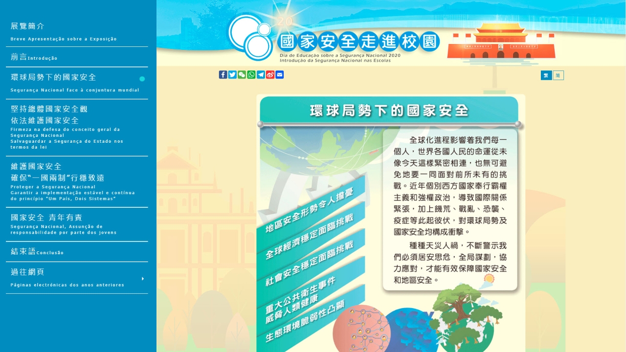 A fim de alargar o conhecimento sobre a segurança de Estado, de grande significado e importância para a população, o governo da Região Administrativa Especial de Macau (RAEM), com o apoio do Gabinete de Ligação do Governo Central na RAEM, organizou uma exposição virtual de fotografias subordinada ao tema “Introdução da Segurança Nacional nas Escolas”, cujo intuito é apresentar o trabalho desenvolvido por Macau.