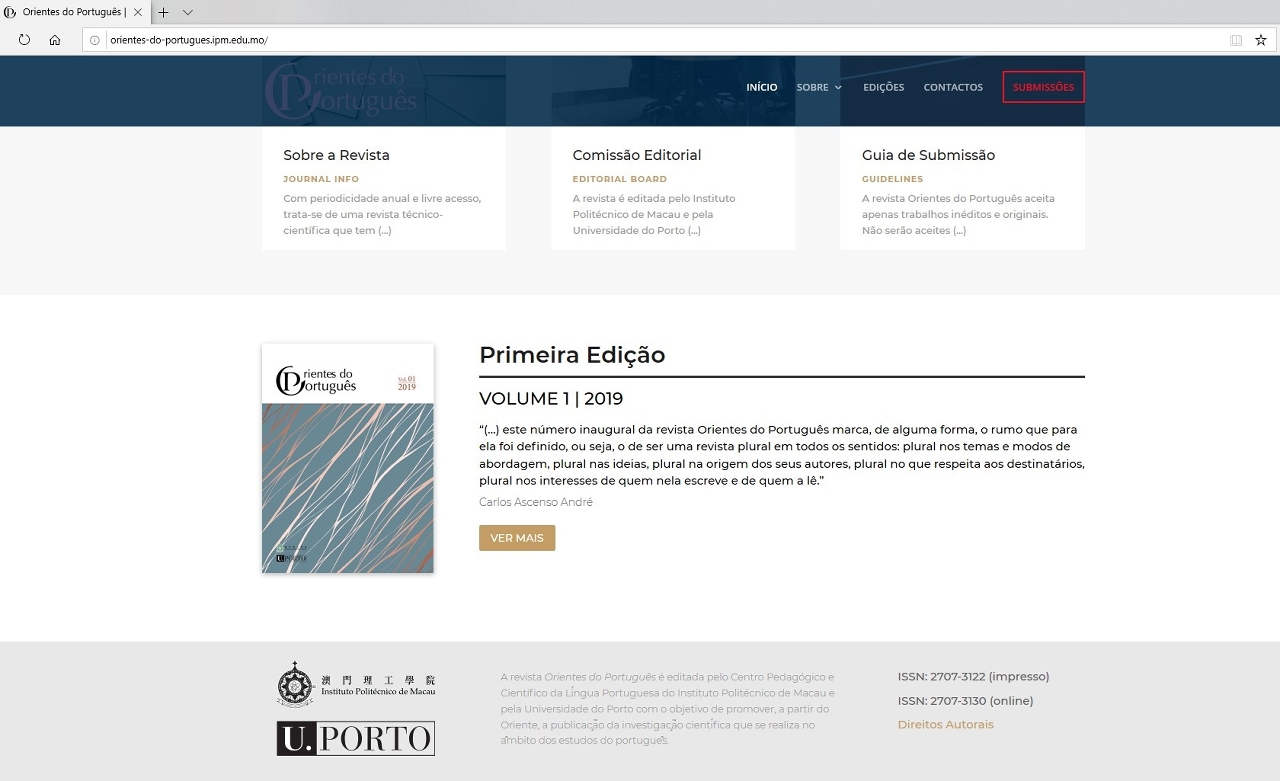 Com periodicidade anual, a revista Orientes do Português foi lançada simultaneamente em formato papel (ISSN: 2707-3122) e digital (e-ISSN: 2707-3130) propiciando diversas plataformas para a divulgação dos resultados de estudos da área da língua e cultura dos países de língua portuguesa, e facilitando a partilha de recursos académicos. O seu volume de estreia, com data de dezembro de 2019, conta com artigos escritos por investigadores advindos de horizontes variados que atuam em instituições de Macau, do Interior da China, de Portugal, do Brasil, da Coreia do Sul e da Dinamarca e tem vindo a receber reiterados elogios e comentários amplamente positivos por parte da comunidade académica internacional que estuda a língua portuguesa. A versão digital da revista já se encontra disponível online (http://orientes-do-portugues.ipm.edu.mo) e o seu segundo volume encontra-se actualmente em preparação com a chamada para artigos aberta até o dia 12 de Julho. A revista aceita contribuições de artigos que apresentem excelentes resultados académicos e que contribuam com o esforço conjunto de reforçar o papel dos académicos de Macau e da Ásia na comunidade académica internacional. A versão em papel pode ser obtida gratuitamente pelos especialistas, académicos, docentes, alunos de língua portuguesa e demais interessados.