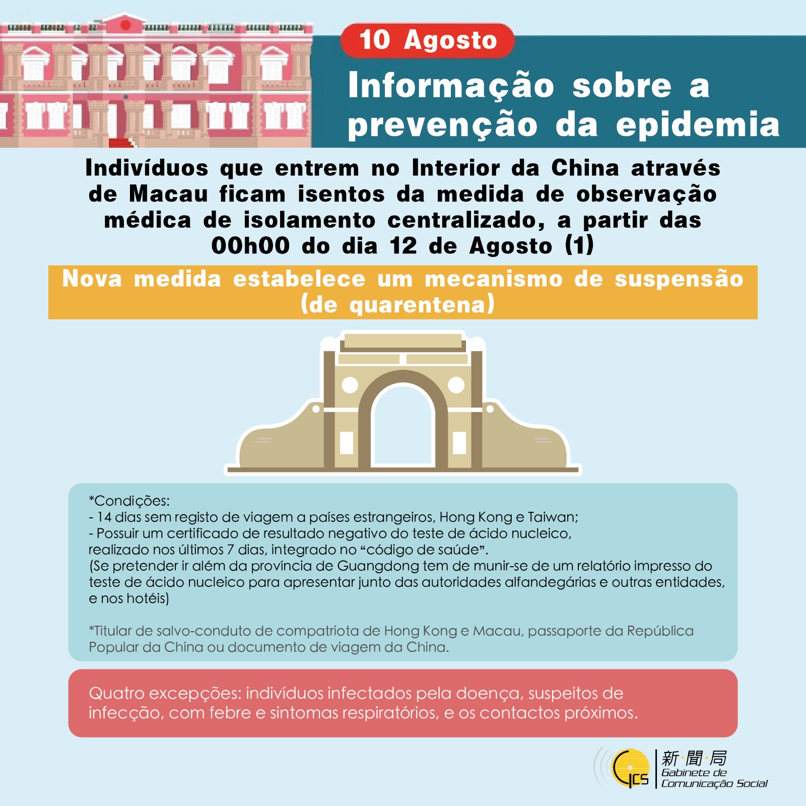 【Infografia】Indivíduos que entrem no Interior da China através de Macau ficam isentos da medida de observação médica de isolamento centralizado, a partir das 00h00 do dia 12 de Agosto.