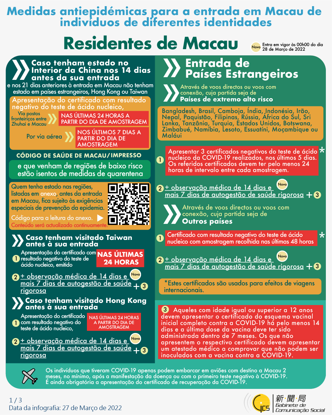 (Infografia)Medidas antiepidémicas para a entrada em Macau de indivíduos de diferentes identidades, actualizadas no dia 27 de Março de 2022