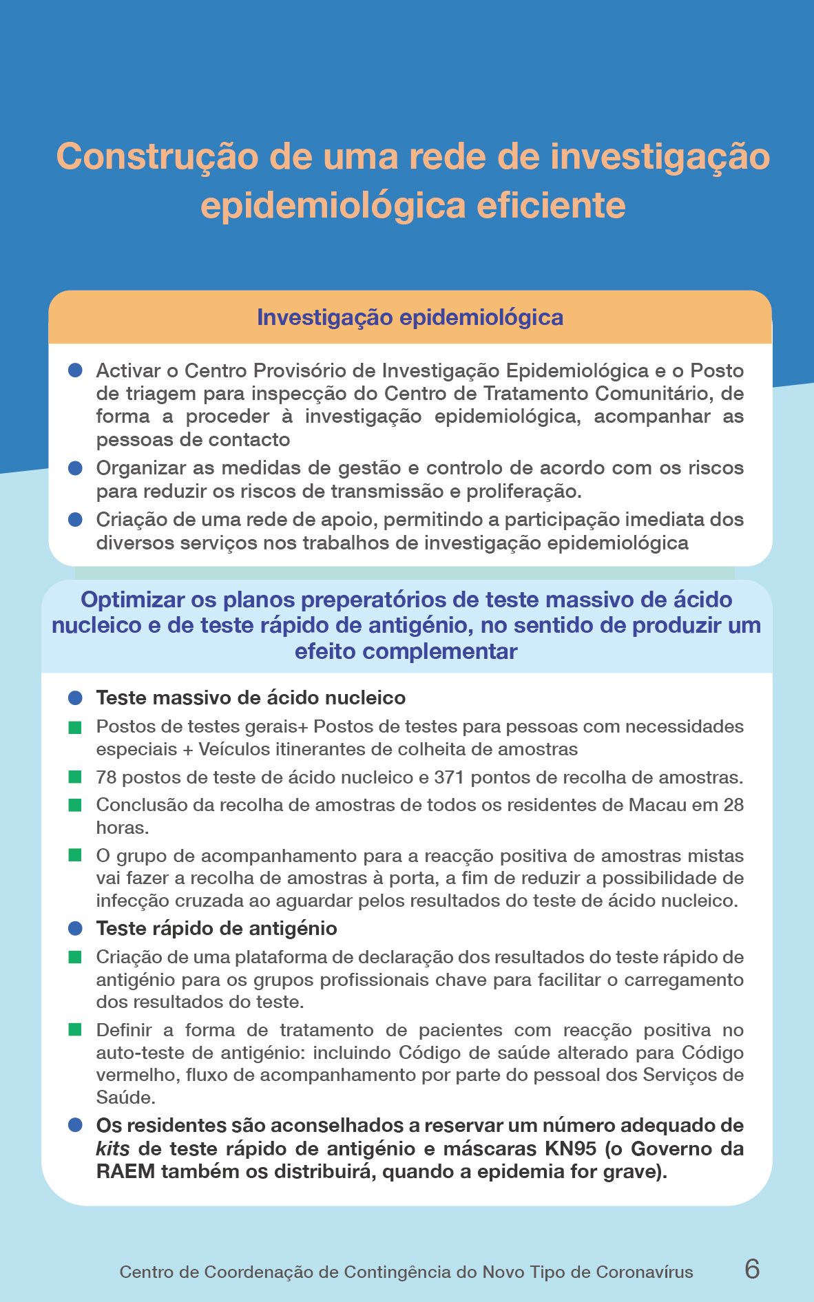 Segundo o Centro de Coordenação, os planos de contingência, que servem de documento-quadro, são uma orientação importante para a luta contra a epidemia em Macau. O Governo da RAEM, com base nos planos de contingência definidos, através dos 15 grupos especializados, continuará a aperfeiçoar e a pormenorizar todos os trabalhos preparativos para a luta contra a epidemia, a ajustar e optimizar, de forma contínua, as diversas medidas de prevenção de acordo com as características das variantes das estirpes e a evolução real da epidemia.