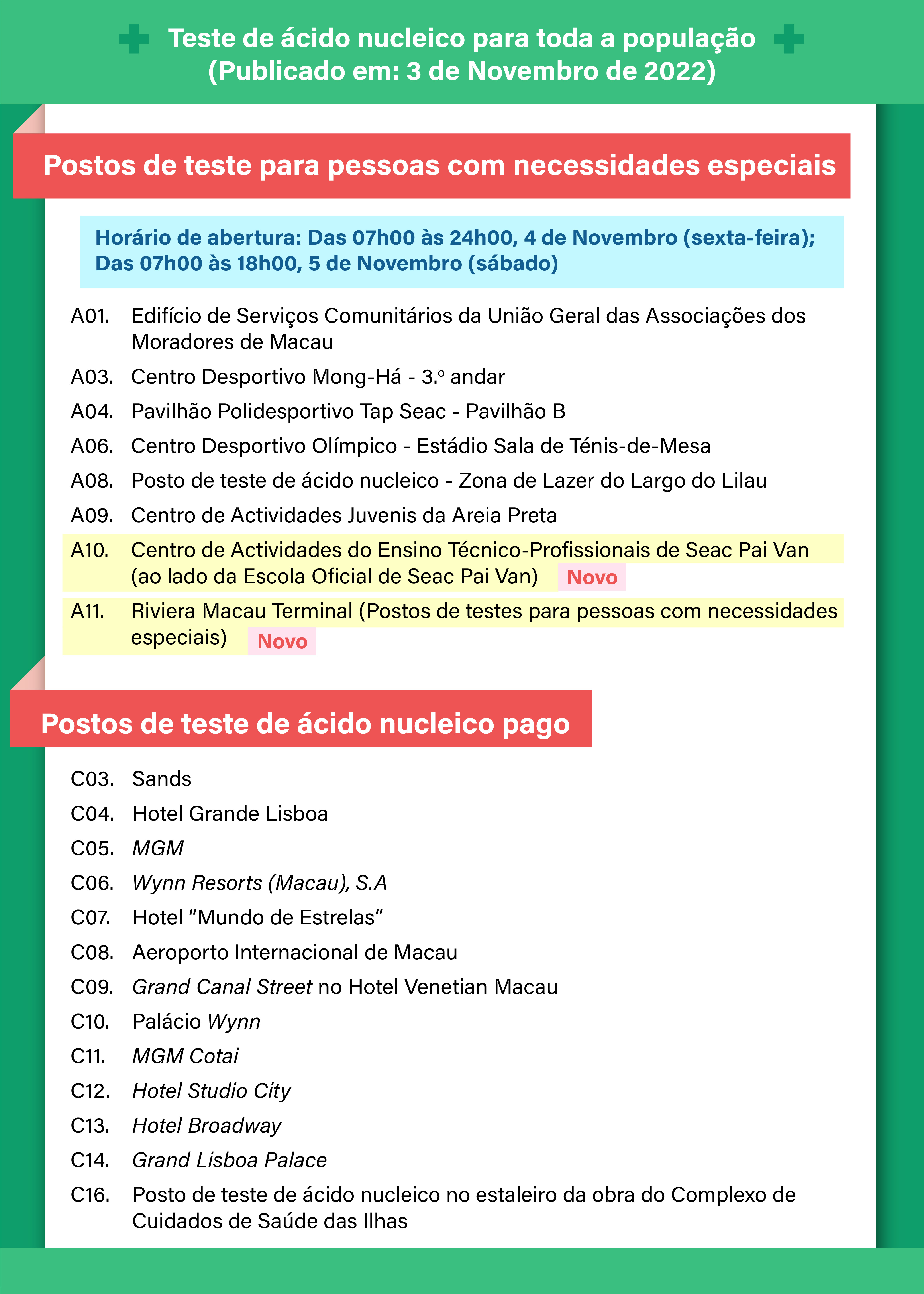 - Na 2.ª ronda do teste massivo, será instalado, especialmente, o posto de teste de ácido nucleico, no Centro de Actividades Educativas Técnico-Profissionais de Seac Pai Van (ao lado da Escola Oficial de Seac Pai Van), correspondendo a um posto destinado às pessoas com necessidades especiais; estará também disponível, o veículo itinerante de recolha de amostras na Avenida de Vale das Borboletas / Terminal. Além disso, será ainda instalado o posto destinado às pessoas com necessidades especiais, na Riviera Macau / Terminal.