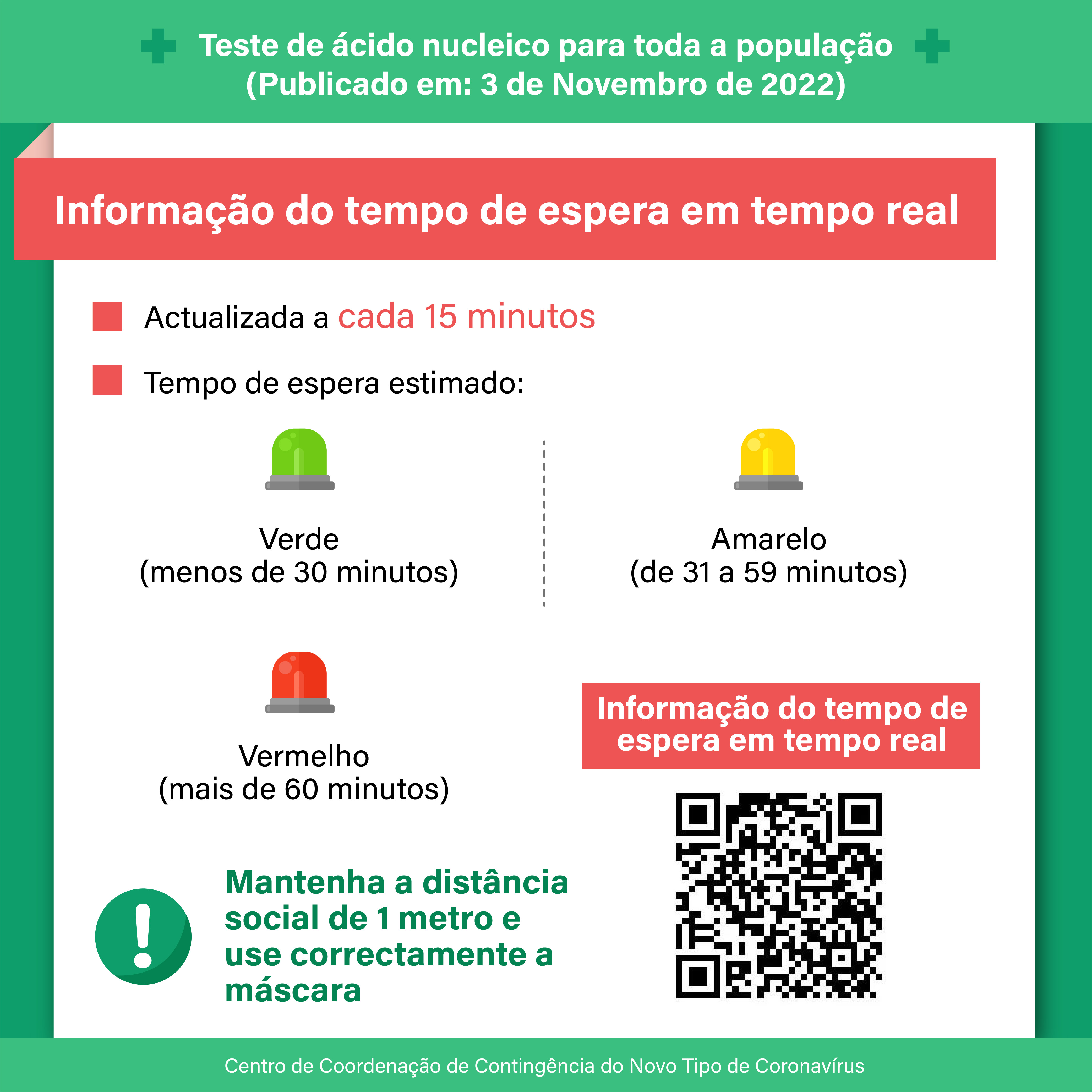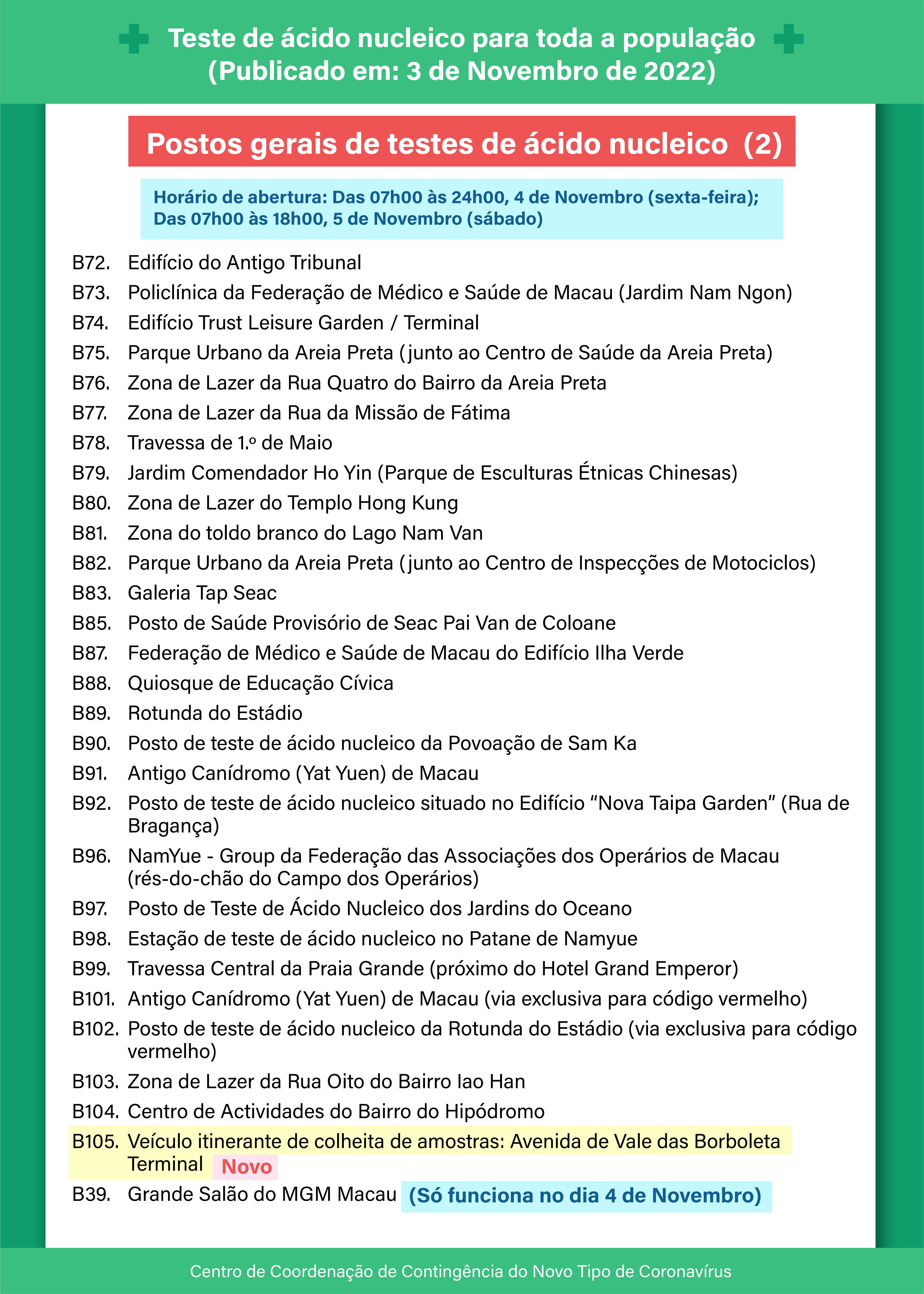 O Centro de Coordenação de Contingência do Novo Tipo de Coronavírus anuncia que a 2.ª ronda do teste de ácido nucleico para toda a população, nos dias 4 e 5 de Novembro, os pormenores são os seguintes: