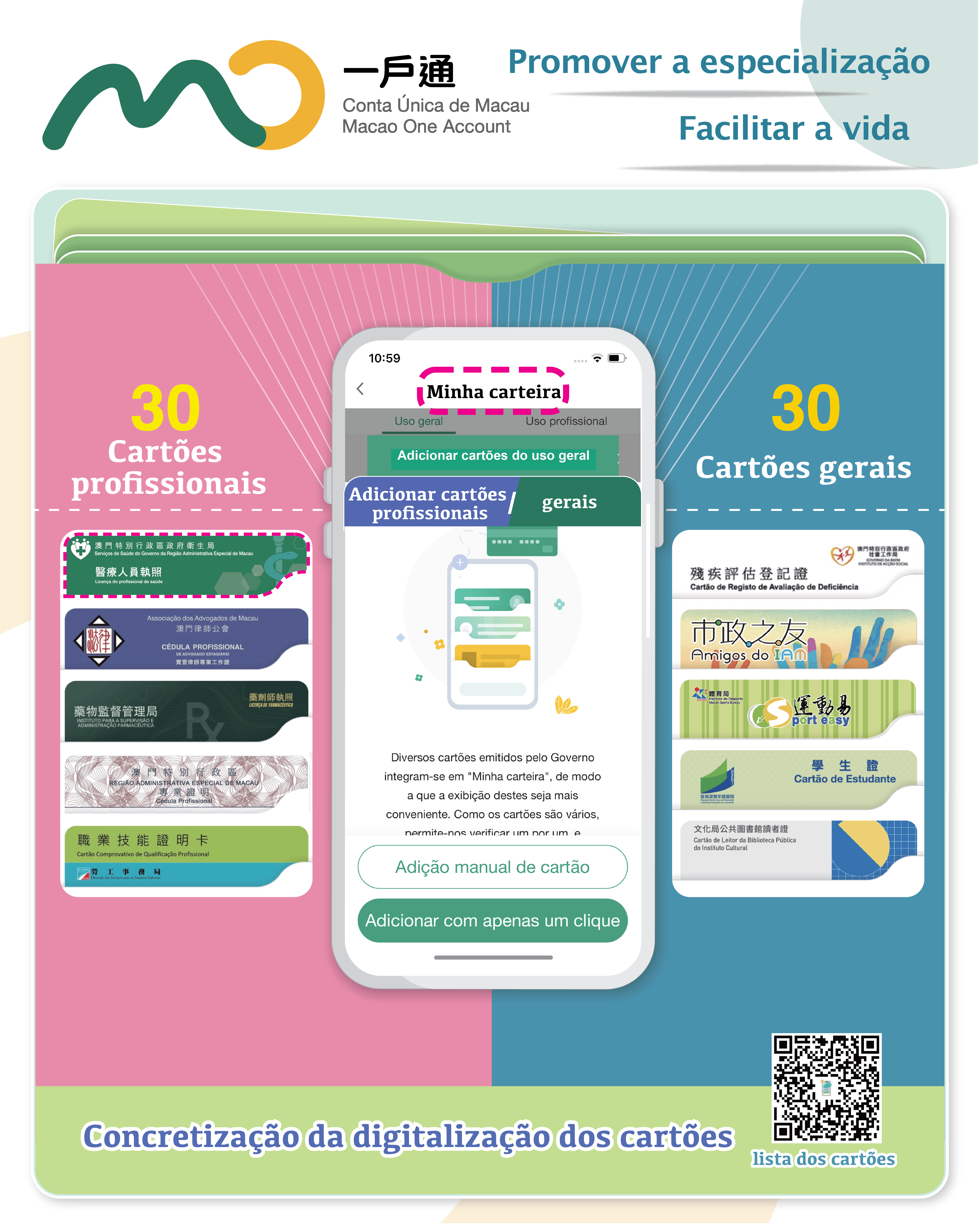 Serão adicionados na carteira electrónica da categoria de “Uso profissional” da Conta Única de Macau 18 licenças dos profissionais de saúde, incluindo as que estão previstas na Lei n.º 18/2020, tais como a licença de médico, médico dentista, médico de medicina tradicional chinesa e de enfermeiro, assim como, no Decreto-Lei n.º 84/90/M, nomeadamente as licenças de mestre de medicina tradicional chinesa, acupuncturista, massagista e odontologista. Os respectivos cartões digitais também podem ser utilizados para exibir perante as autoridades e os cidadãos, as licenças dos profissionais de saúde e consultar oportunamente os seus dados de registo. Por enquanto, somando os cartões profissionais electrónicos que já foram lançados, existem um total de 30 cartões profissionais num universo de 42 tipos de áreas profissionais que já foram digitalizados.