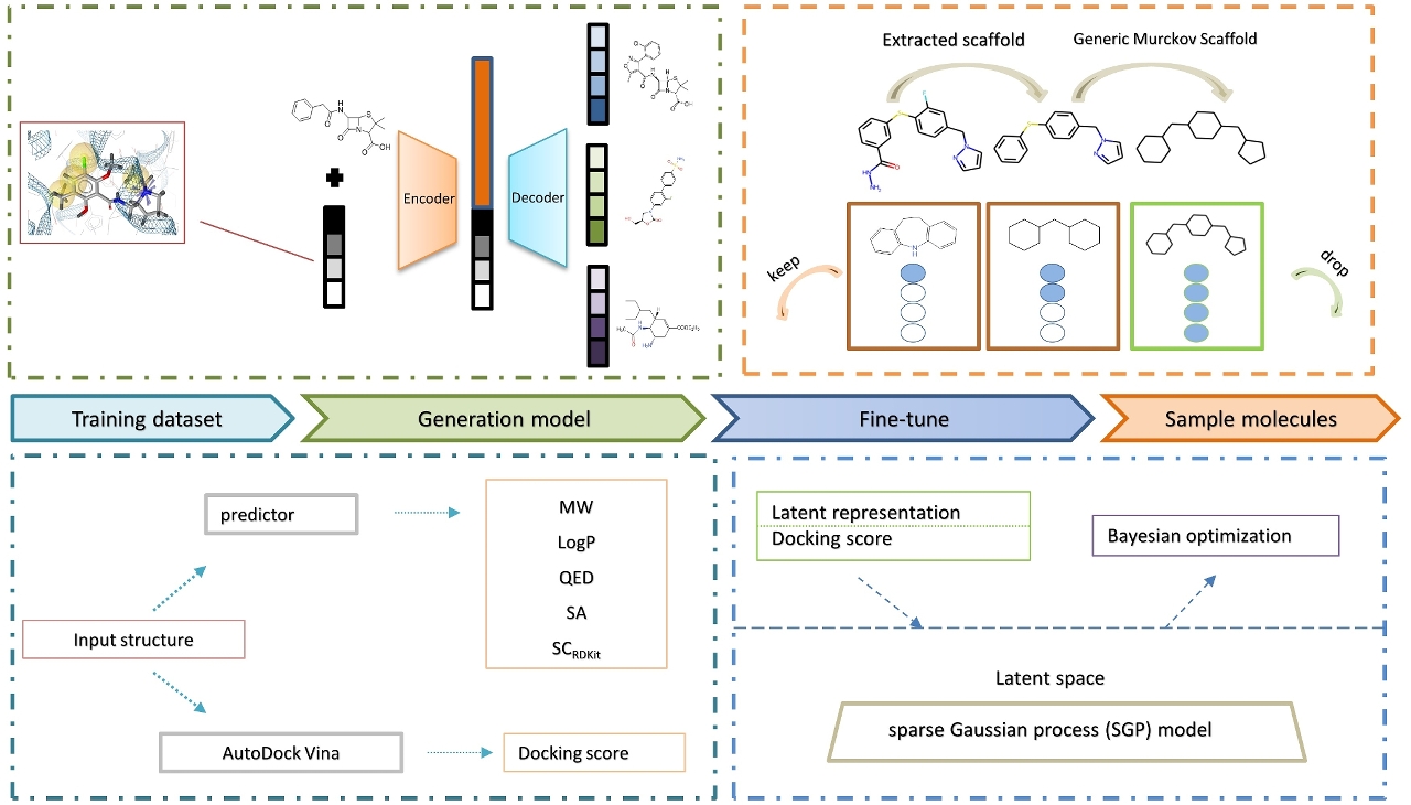 Este método realiza uma procura iterativa em todo o espaço químico usando um modelo generativo centrado no ligante que corresponde ao farmacóforo do composto activo, seleccionando compostos que tenham maior afinidade com o alvo biológico. O modelo é criado principalmente com base em conditional variational autoencoder multi-objectivo, restringindo simultaneamente propriedades sintetizáveis, semelhantes a drogas e outras propriedades físico-químicas relevantes durante a procura no espaço químico, de modo a aumentar o potencial da produção de moléculas. O docking molecular é usado para orientar a optimização de compostos, e a pontuação de docking é combinada com a optimização bayesiana para ajustar o modelo para obter moléculas candidatas potenciais com alta probabilidade de afinidade com alvos biológicos específicos. O modelo introduziu ainda um filtro baseado na similaridade do “andaime” molecular no processo de ajuste fino, o que ajuda o modelo a obter uma estrutura molecular mais diversificada durante a procura no espaço químico.