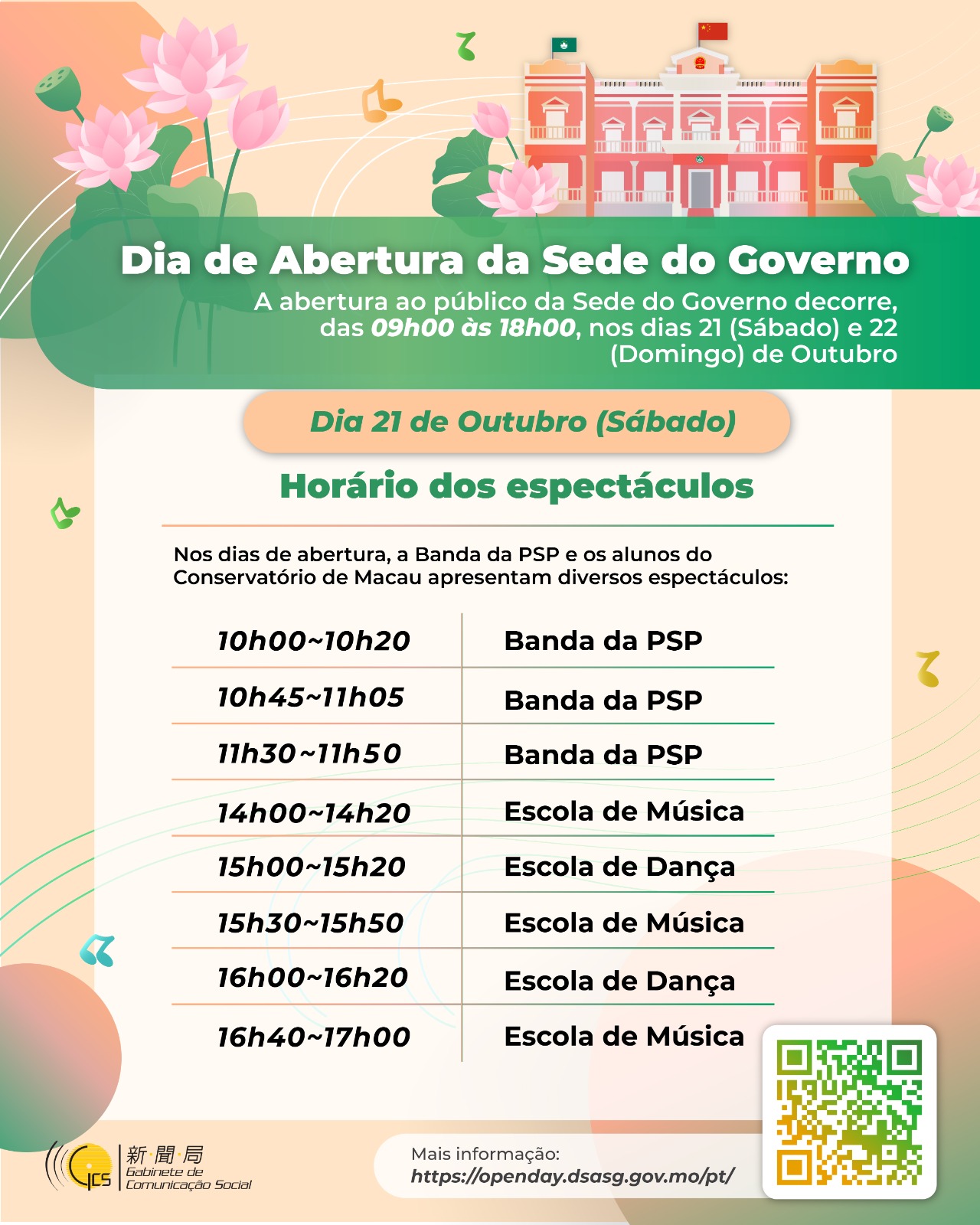 A população pode ainda assistir a uma série de espectáculos, nomeadamente, da Banda da PSP e dos alunos da Escola de Música e Escola de Dança do Conservatório de Macau do Instituto Cultural. A Direcção dos Serviços de Correios e Telecomunicações também terá disponível um posto temporário, no lado oposto à Sede do Governo, no lago Nam Van, onde se poderá pôr o carimbo comemorativo, comprar os produtos filatélicos, no âmbito dos dias da abertura da Sede do Governo.