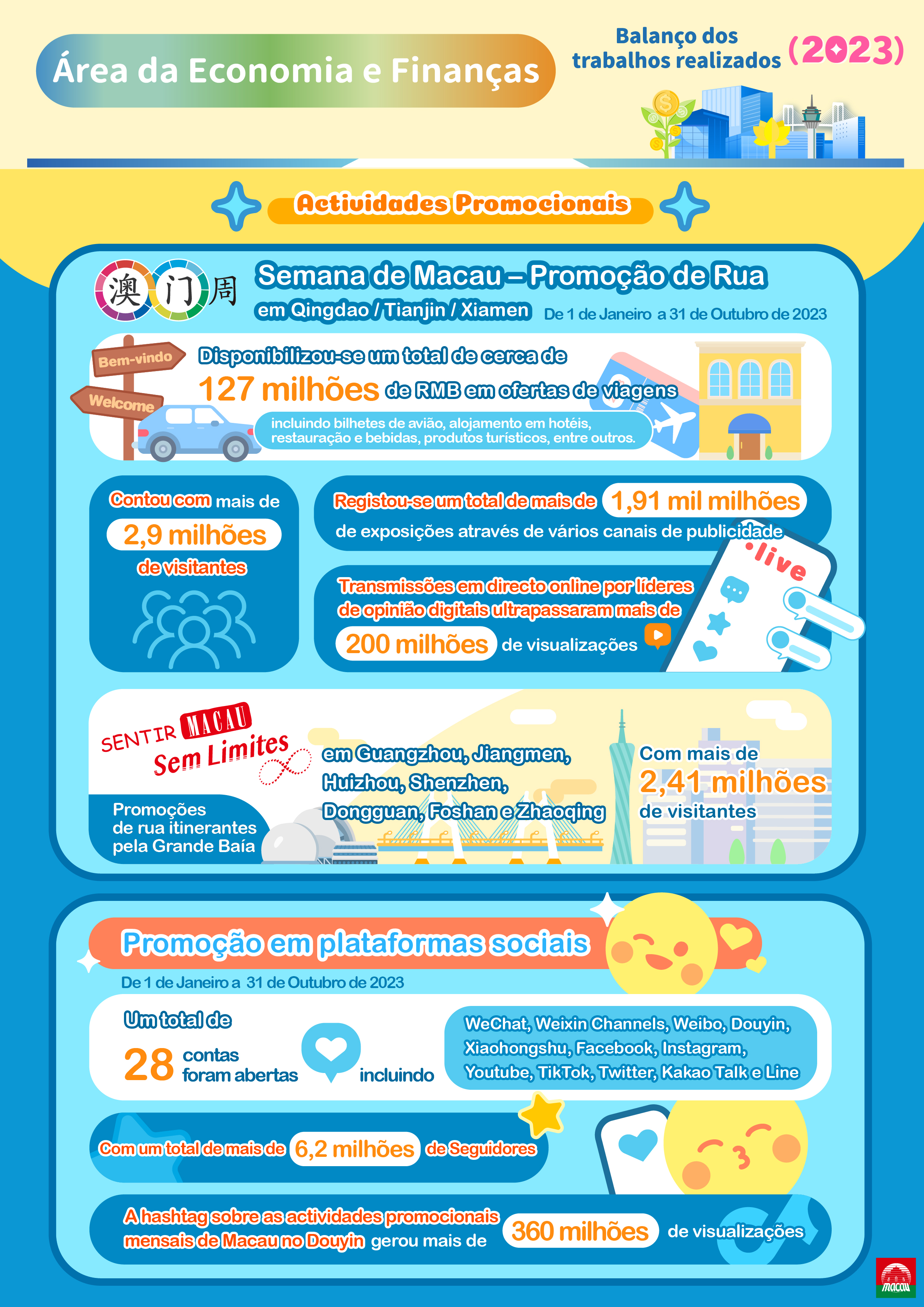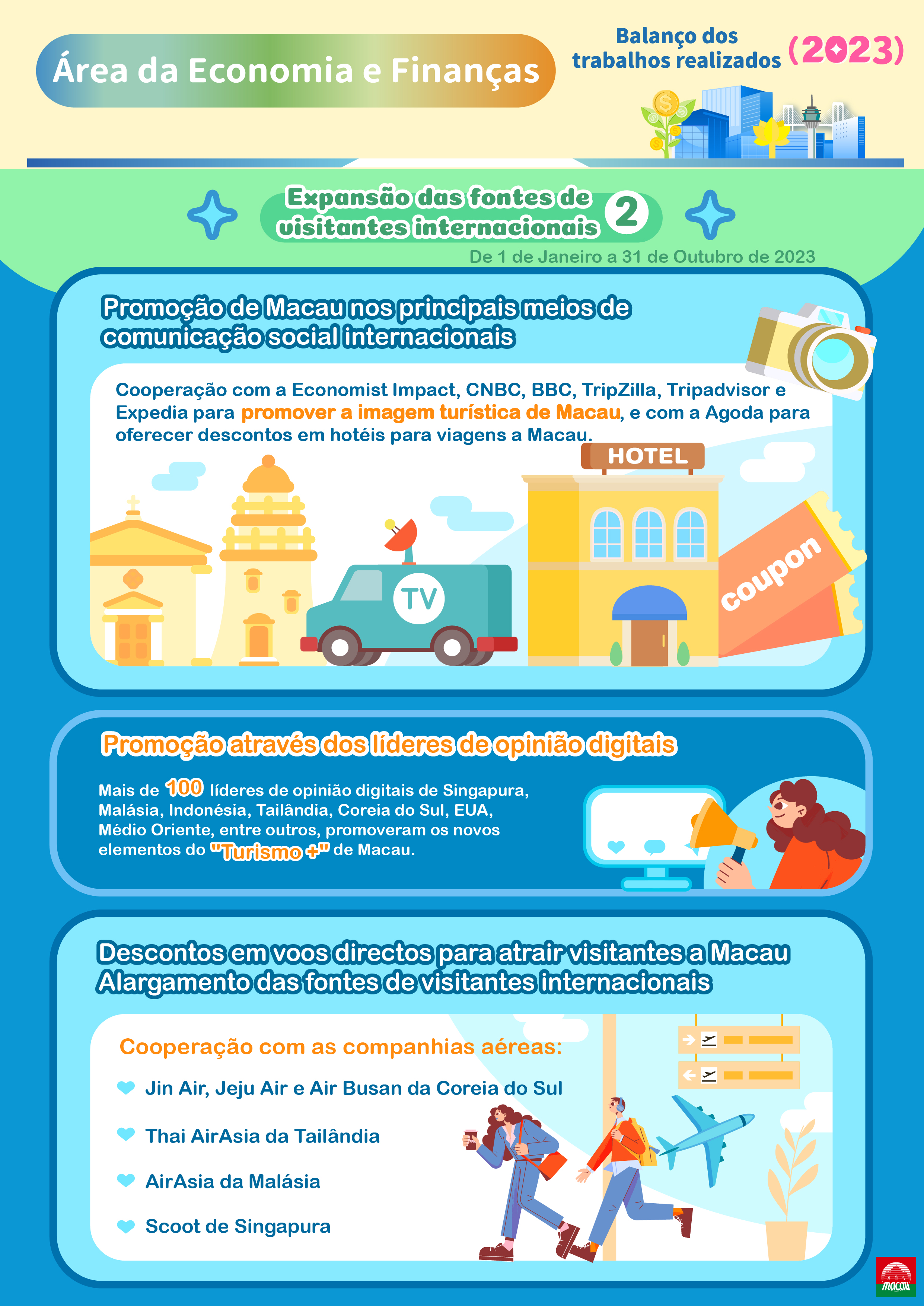 Através do programa “Desfrutar de Ofertas‧Excursão a Macau”, a DST tem lançado ofertas turísticas especiais bilhetes de avião a alojamento hoteleiro em Macau, direccionadas ao mercado do Interior da China e mercados no exterior. Até ao final de Outubro, cupões de hotéis com 50% de desconto lançados no âmbito da promoção impulsionaram reservas no valor de perto de 1,1 mil milhões de renminbis, enquanto as compras de bilhetes de avião com desconto levaram à realização de reservas no valor de perto de 153 milhões de patacas. Foi também lançado o programa “Desfrutar de Ofertas‧Excursão a Macau” visando atrair mais visitantes do Interior da China, da região de Taiwan e mercados internacionais a visitarem Macau em excursões. De 2 de Fevereiro a 31 de Outubro deste ano, foram recebidos pedidos de apoio financeiro relativos a 14.532 grupos turísticos.
