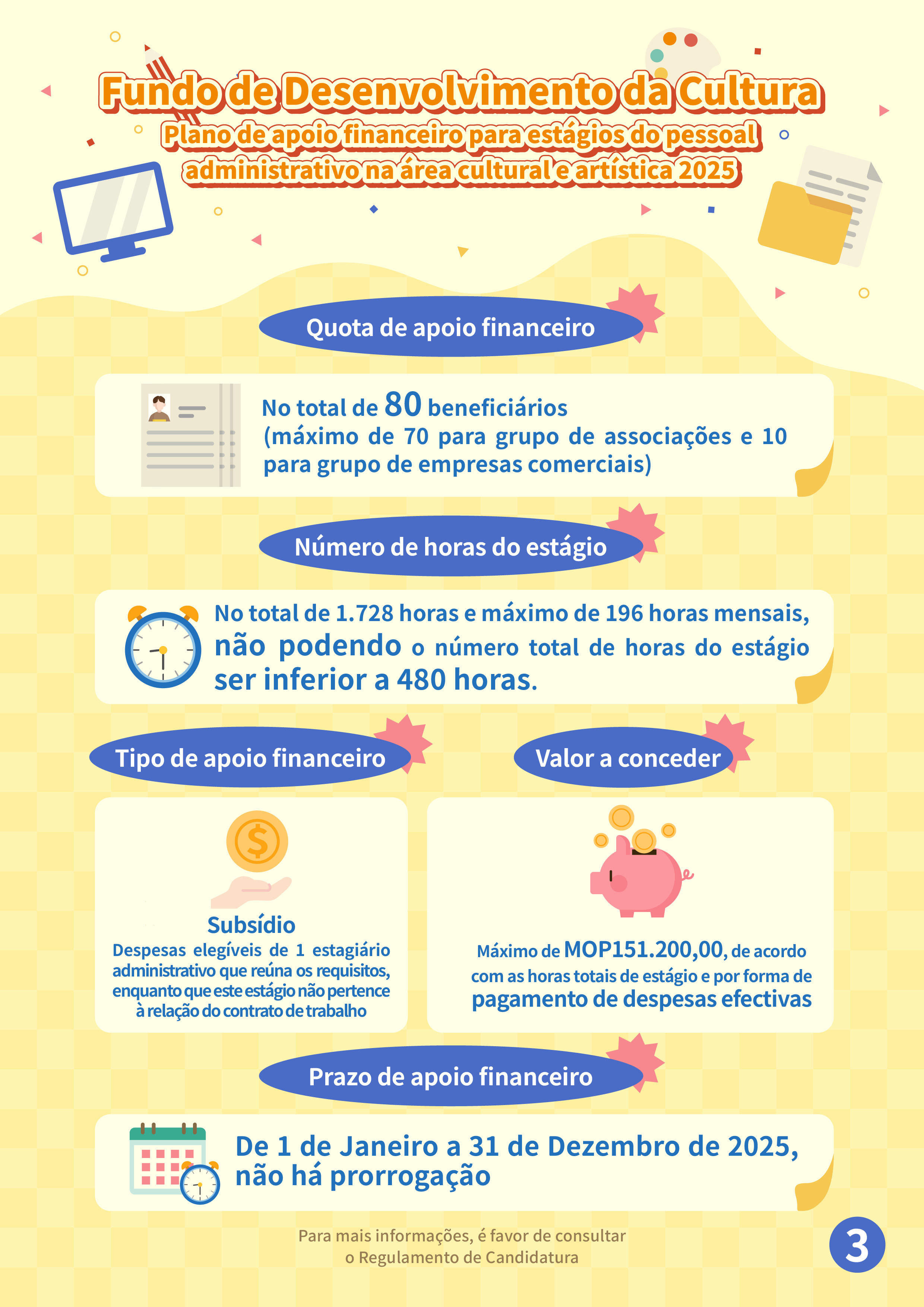 De 24 de Setembro a 18 de Outubro, estarão abertas as candidaturas ao “Plano de apoio financeiro para estágios do pessoal administrativo na área cultural e artística 2025”, visando encorajar as associações ou empresas comerciais que se dedicam às áreas artísticas e culturais de Macau, a proporcionar oportunidades de estágios no planeamento, coordenação, administração e técnica das actividades culturais e artísticas. As associações ou empresários comerciais que se candidatem, podem recomendar um residente permanente de Macau, com idade compreendida entre os 18 e os 40 anos. Serão subsidiadas as despesas de estágio em 2025 para o pessoal administrativo que reúna os requisitos, até um máximo de 151.200 patacas, que serão reembolsadas de acordo com o número total de horas do estágio efectivo. O número de beneficiários é de 80, incluindo um limite máximo de 70 para o grupo das associações e de 10 para o grupo dos empresários.