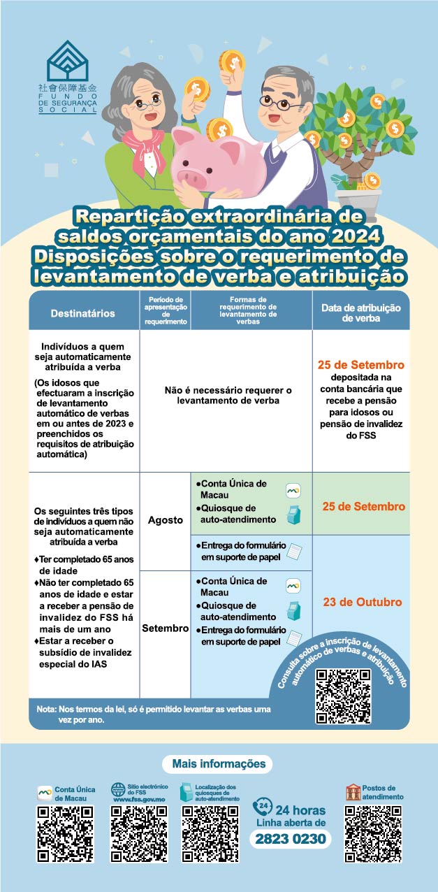 O Fundo de Segurança Social lembra aos indivíduos que ainda não efectuaram a inscrição de levantamento automático de verbas, para fazer a inscrição na altura de requerimento de levantamento de verbas. Para mais informações, podem visitar o sítio electrónico do FSS: www.fss.gov.mo ou contactar o FSS por via telefónica 28532850 durante o horário de expediente.