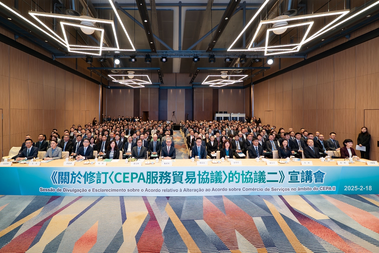 A Sessão de Divulgação e Esclarecimento sobre o Acordo relativo à Alteração ao Acordo sobre Comércio de Serviços no âmbito do CEPA II, organizada conjuntamente pelo Ministério do Comércio da República Popular da China e pelo Governo da Região Administrativa Especial de Macau (RAEM), realizou-se, hoje (dia 18), no Centro de Convenções e Entretenimento da Torre de Macau. O Ministério do Comércio da República Popular da China e os representantes de diversos ministérios e comissões do Interior da China participaram na sessão e procederam ao esclarecimento, permitindo que todos os sectores de Macau compreendam melhor o conteúdo das novas políticas do CEPA, que entrará oficialmente em vigor no dia 1 de Março.