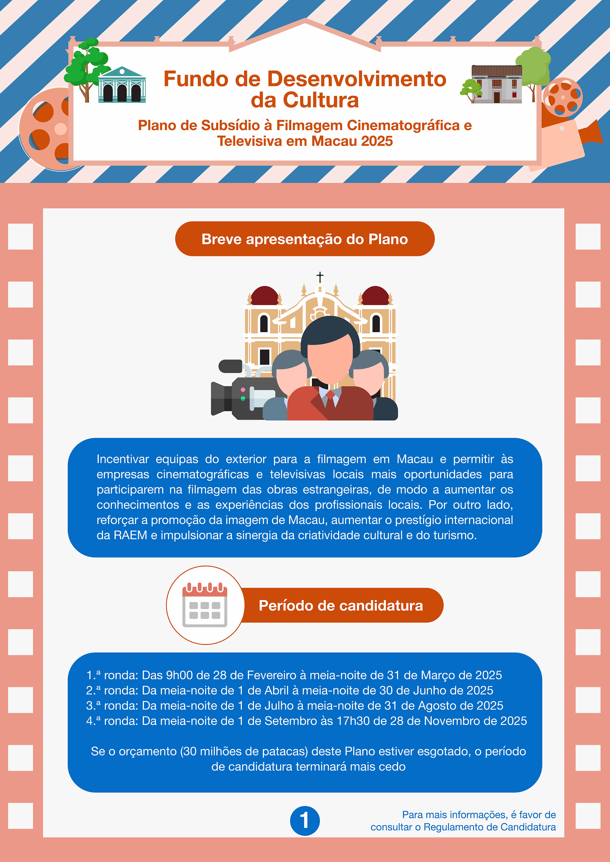 Este ano, serão lançadas quadro rondas de candidatura, com a primeira ronda de 28 de Fevereiro a 31 de Março de 2025. Se o orçamento deste Plano estiver esgotado, o período de candidatura terminará mais cedo. É aceite a candidatura do projecto cinematográfico e televisivo estrangeiro, que é dirigido por uma equipa de filmagem estrangeira, com filmagem em Macau não inferior a 3 dias, e que não foi dado início a qualquer parte da filmagem em Macau antes da data de apresentação confirmada de candidatura. As candidaturas devem ser apresentadas pelos empresários comerciais locais que sejam unidades de produção em Macau, cujas actividades devem estar relacionadas com a produção cinematográfica e televisiva. Dentro do período de apoio financeiro, a exibição pública do projecto financiado deve estar concluída, tendo em conta que a duração do mesmo e dos locais de Macau que serviram de cenários do filme devem estar em conformidade com os requisitos no Plano.