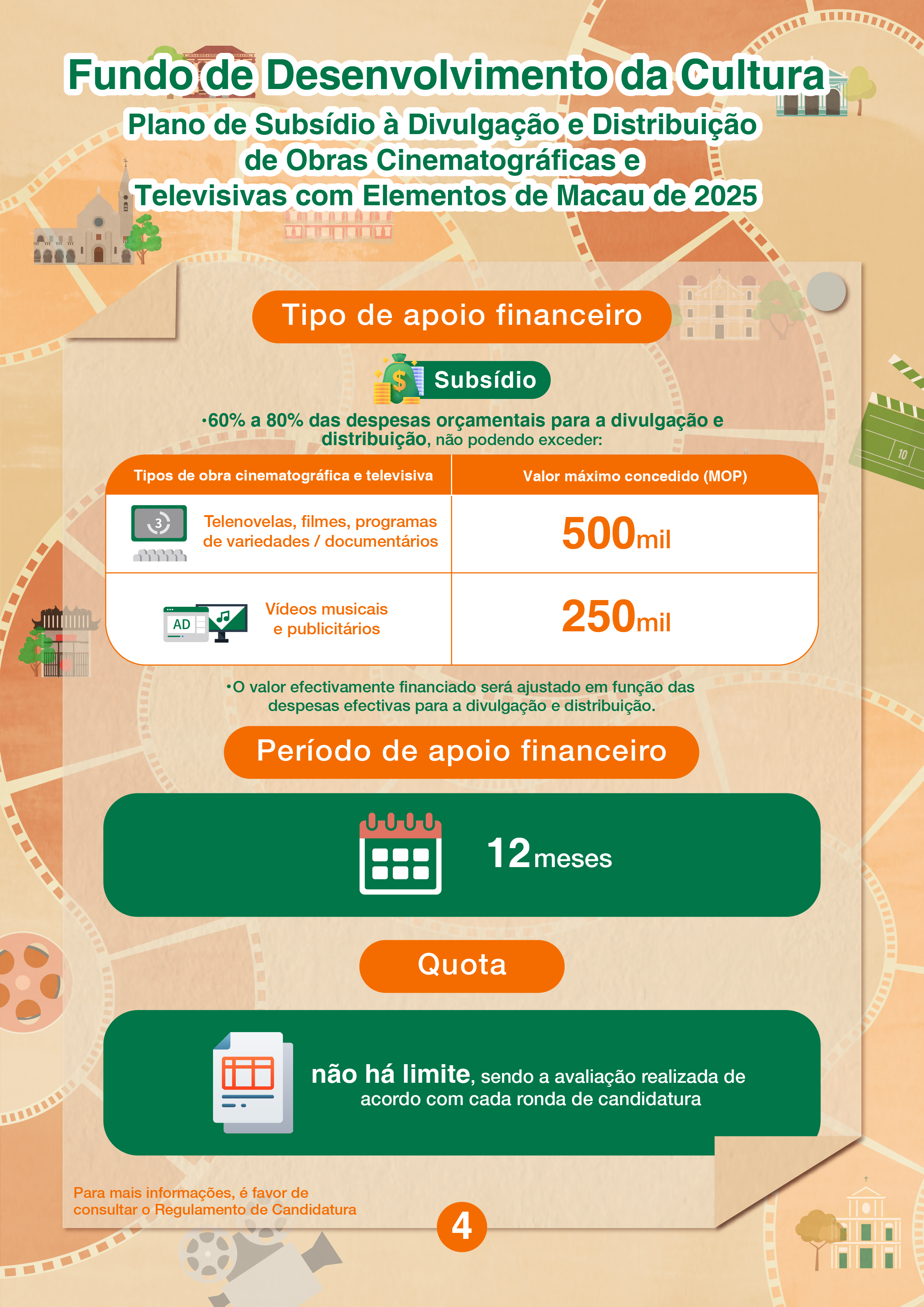 Serão três rondas de candidaturas para o “Plano de Subsídio à Divulgação e Distribuição de Obras Cinematográficas e Televisivas com Elementos de Macau de 2025”, nomeadamente, a primeira ronda de 3 a 30 de Junho; a segunda ronda de 1 de Julho a 31 de Agosto; a terceira ronda de 1 de Setembro a 28 de Novembro. Este Plano visa apoiar as obras cinematográficas e televisivas com elementos de Macau que estão concluídas e prontas a ser exibidas, cuja divulgação e distribuição serão efectuadas através da participação em festivais de cinema ou da realização da exibição ao público.