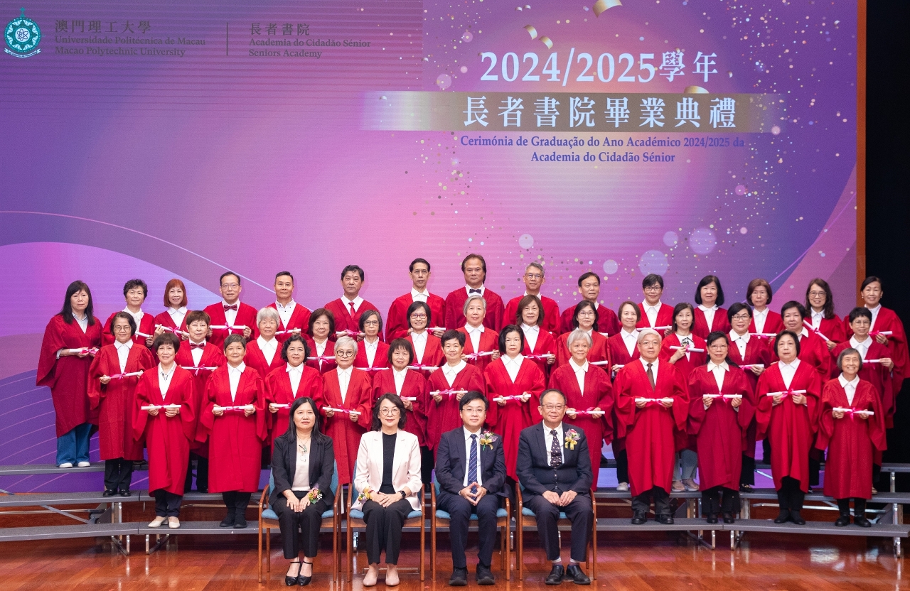A Cerimónia de Graduação da Academia do Cidadão Sénior da Universidade Politécnica de Macau foi presidida pelo Reitor da UPM, Marcus Im, pela Presidente Substituta do Instituto de Acção Social do Governo da RAEM, Hoi Va Pou, pelo Director-Geral dos Serviços das Cáritas de Macau, Philip, Yuen Chi Hoi, e a Directora Substituta da Academia do Cidadão Sénior, Lídia Tang. Marcus Im felicitou os formandos pelo sucesso na aprendizagem e referiu que, sendo a primeira instituição de ensino superior de Macau que dispõe de cursos destinados exclusivamente aos idosos, a Academia do Cidadão Sénior da Universidade Politécnica de Macau tem vindo a pôr em prática o conceito de educação contínua. Com os 26 anos de experiência na organização de acções formativas, a ACS apoia a aprendizagem contínua dos idosos, através da organização de diversos cursos. Em articulação com as Linhas de Acção Governativa do Governo da RAEM em matéria de apoio à aprendizagem contínua dos residentes, a ACS continua a organizar cursos nas áreas da informática, línguas, cultura, artes e saúde.