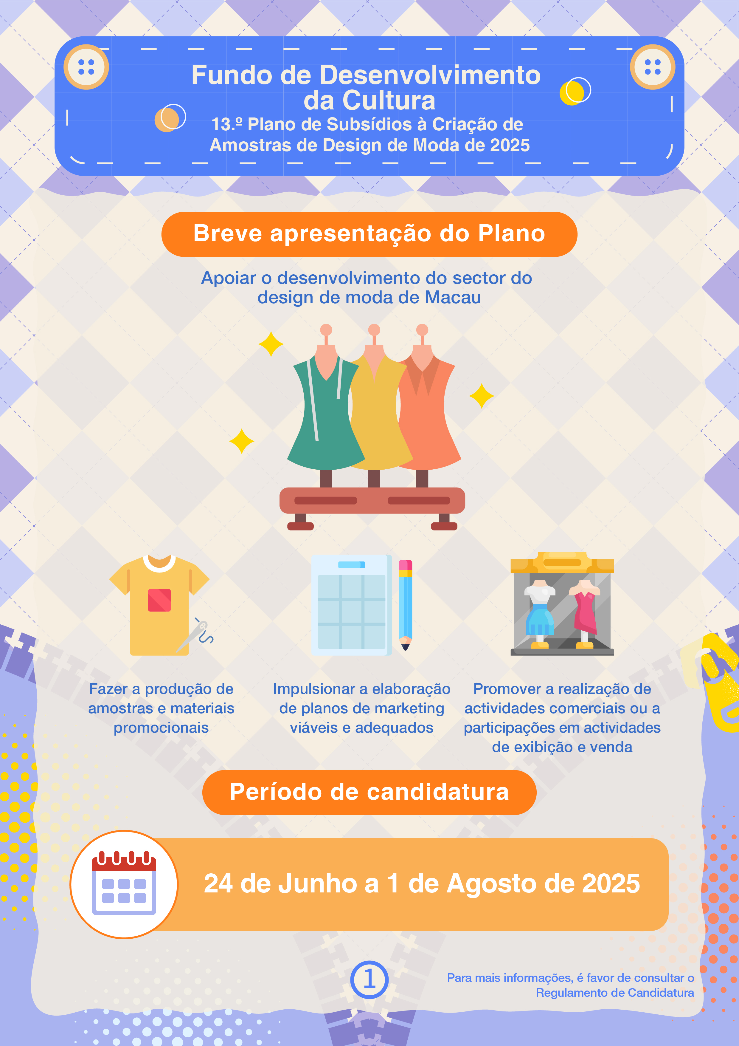 O Fundo de Desenvolvimento da Cultura (FDC) irá aceitar candidaturas, de 24 de Junho a 1 de Agosto, ao “13.º Plano de Subsídio à Criação de Amostras de Design de Moda”, com o objectivo de apoiar a produção de amostras e a promoção de colecções de moda originais de designers locais, impulsionando continuadamente o desenvolvimento da indústria do design de moda em Macau.