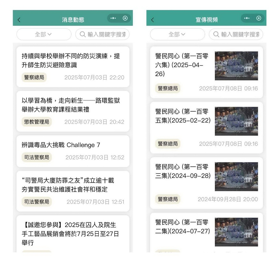No que diz respeito às informações policiais, para além de se manter a consulta “one-stop” de notícias, vídeos publicitários e prestação de serviços das forças e serviços de segurança de Macau, esta actualização também se aperfeiçoou a classificação das informações e a forma de pesquisa para que os cidadãos e turistas possam conhecer, de forma mais conveniente, a situação do trabalho policial de Macau, reforçando o seu conhecimento e a confiança na polícia. Ao mesmo tempo, no que diz respeito à comunicação de informações policiais, através de análises aos novos métodos de prática de crimes, são transmitidas ao público novidades sobre trabalhos policiais, conhecimentos jurídicos e medidas de prevenção, a fim de reforçar as noções e capacidade dos cidadãos e turistas na prevenção de crimes, contribuindo desta forma para um ambiente social mais seguro e estável.