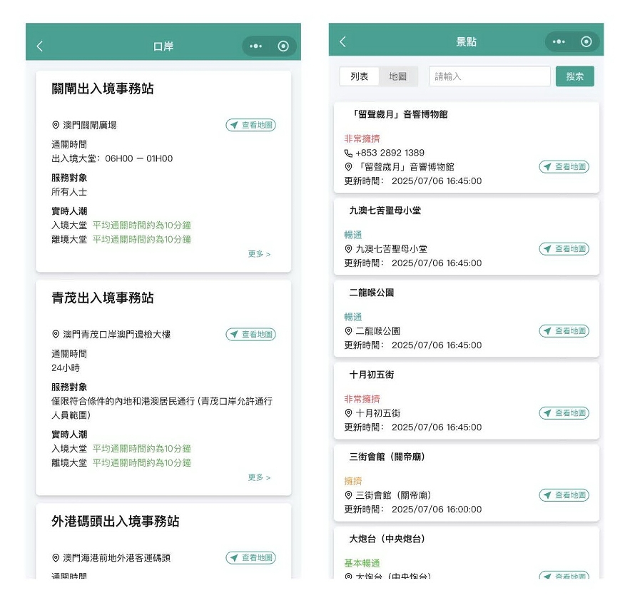 Nesta actualização destaca-se ainda a introdução e o reforço de recursos e de conteúdos. Tendo em conta os problemas de segurança que os cidadãos e turistas podem encontrar nas suas deslocações, a nova versão de “Macau pacífico e seguro” dispõe de um módulo dedicado a esta matéria. Através de um mapa em tempo real, os utilizadores podem conhecer as medidas policiais que estão a ser implementadas nas diversas zonas, a situação do fluxo de pessoas nos postos fronteiriços, os locais de realização de eventos de grande envergadura, entre outras informações. Foram ainda integradas informações sobre o ajustamento dos itinerários dos transportes públicos e a situação do controlo do trânsito rodoviário para facilitar aos cidadãos e turistas o planeamento dos percursos e a previsão razoável do tempo de deslocação, de forma a evitar transtornos devidos a engarrafamentos ou alterações de itinerários, garantindo uma deslocação mais suave.