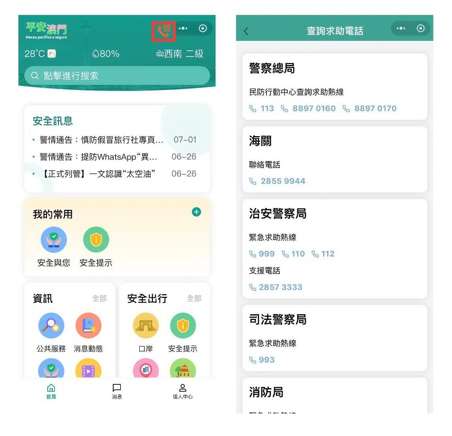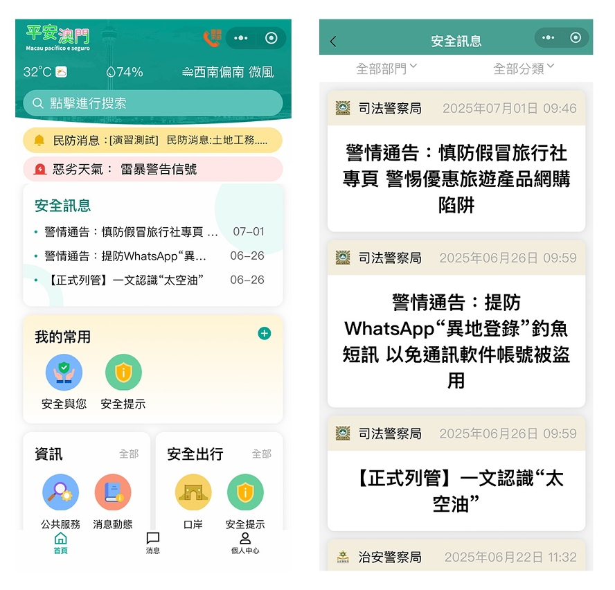 Com vista a implementação cabal dos três conceitos policiais referidos pelo Secretário para a Segurança (“policiamento activo”, “policiamento comunitário” e “policiamento de proximidade”), de forma a estabelecer uma relação mais estreita e harmoniosa entre a polícia e o cidadão, elevar a eficiência e a qualidade dos serviços policiais, alargar e facilitar as formas de acesso dos cidadãos e turistas às informações policiais, de segurança e de deslocação diária, foi lançada hoje (dia 8) a versão 2.0 do mini programa de WeChat "Macau pacífico e seguro". A presente actualização centra-se na integração das informações dos serviços policiais e de segurança de Macau, inovando, de forma abrangente, as diversas funções e a interface operacional, procurando desta forma tornar este mini programa num “pequeno assistente” de segurança dos cidadãos e visitantes na vida diária e viagem em Macau.