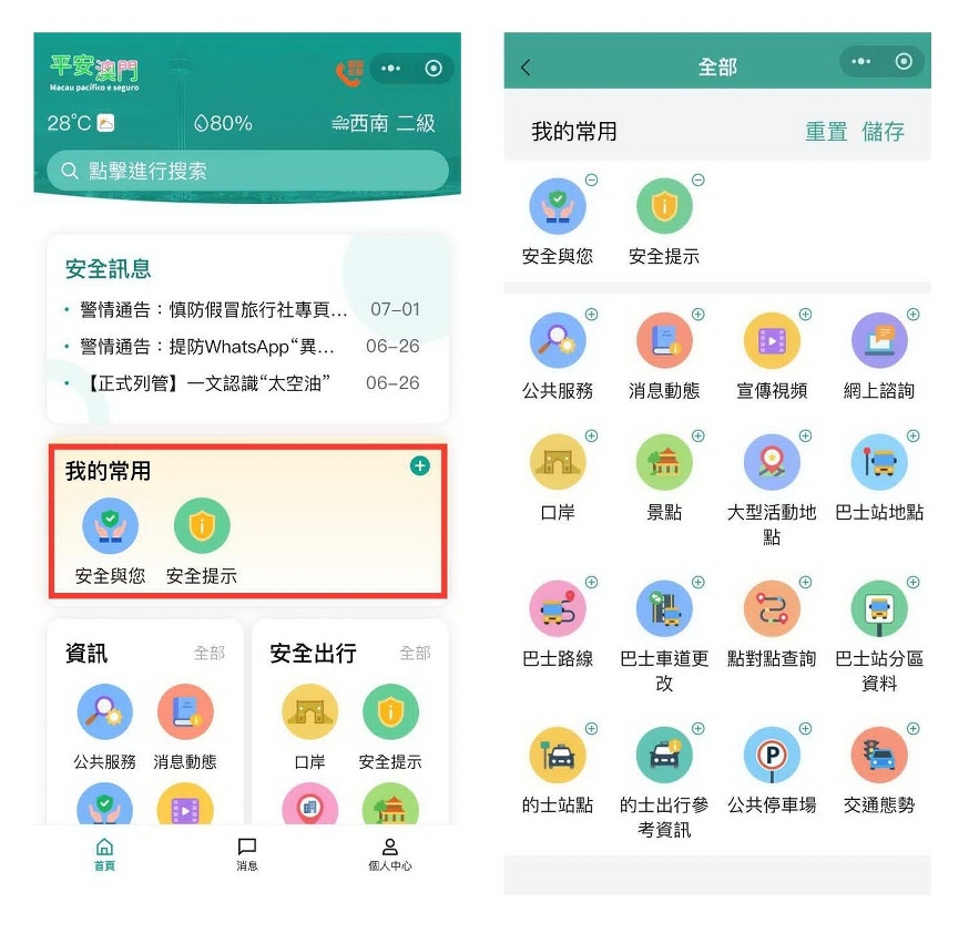 No que diz respeito à interface operacional, a nova versão do “Macau pacífico e seguro” adopta princípios de design mais simplificados e eficientes, reformulando a disposição dos elementos do interface. Para melhor servir os utilizadores, o mini programa também dispõe de uma área de atendimento personalizado, onde os utilizadores podem configurar, no módulo funcional “O Meu Uso Comum”, os serviços de acordo com as suas necessidades e hábitos, podendo também colocar no “Centro Individual” as informações dos serviços que pretendem acompanhar, a fim de aumentar a conveniência e a satisfação dos utilizadores durante a utilização deste mini programa.