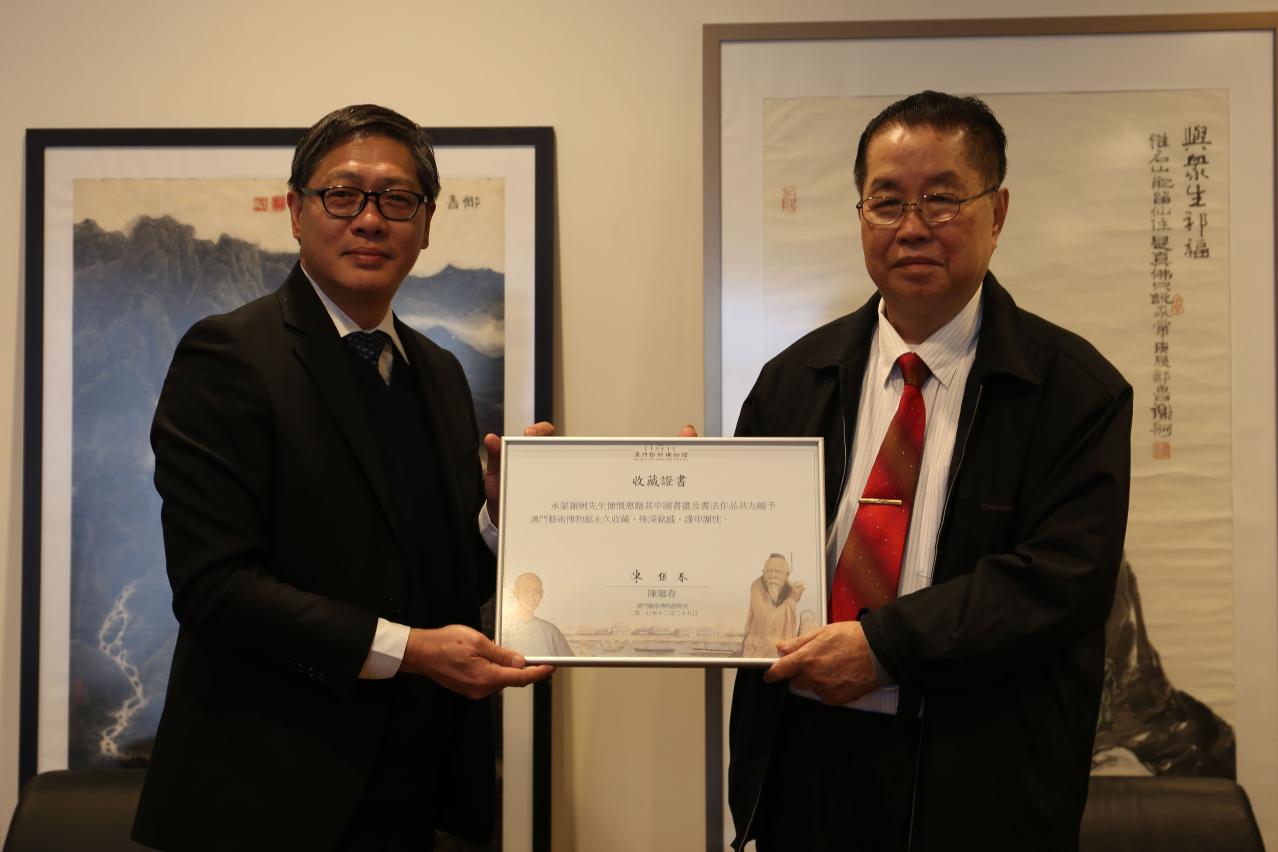 澳门着名画家谢舸向文化局澳门艺术博物馆捐赠所创作的中国书法作品五幅及中国画四幅,捐赠仪式于一月十五日(星期一)上午十一时,在该馆二楼嘉宾接待区举行。由澳门艺术博物馆馆长陈继春向作者颁发捐赠证书,并致以衷心感谢。不少澳门书画界知名人士出席了活动。