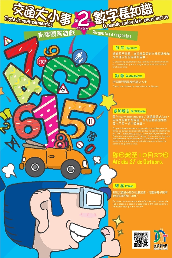 交通事务局为持续向市民推广交通安全,加深他们对本澳交通知识的认识,共建良好的出行环境,推出「交通大小事 数字长知识」第二期有奖问答游戏,参加者只要答对所有问题,便可自动参加抽奖获取奖品以作鼓励,详情可浏览交通事务局网页www.dsat.gov.mo或致电交通事务专线8866 6363查询。