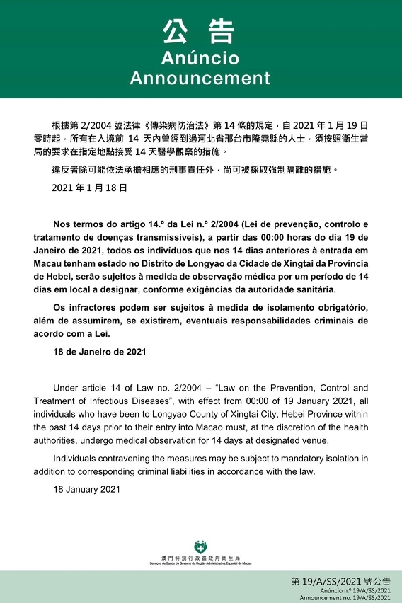 新型冠状病毒感染应变协调中心宣布,因应河北省及黑龙江省的最新疫情发展,卫生局根据第2/2004号法律《传染病防治法》第14条的规定,自2021年1月19日零时起,所有在入境前14天内曾经到过河北省邢台市隆尧县或黑龙江省大庆市龙凤区的人士,须按照卫生当局的要求在指定地点接受14天医学观察,违反者除可能依法承担相应的刑事责任外,尚可被采取强制隔离的措施。