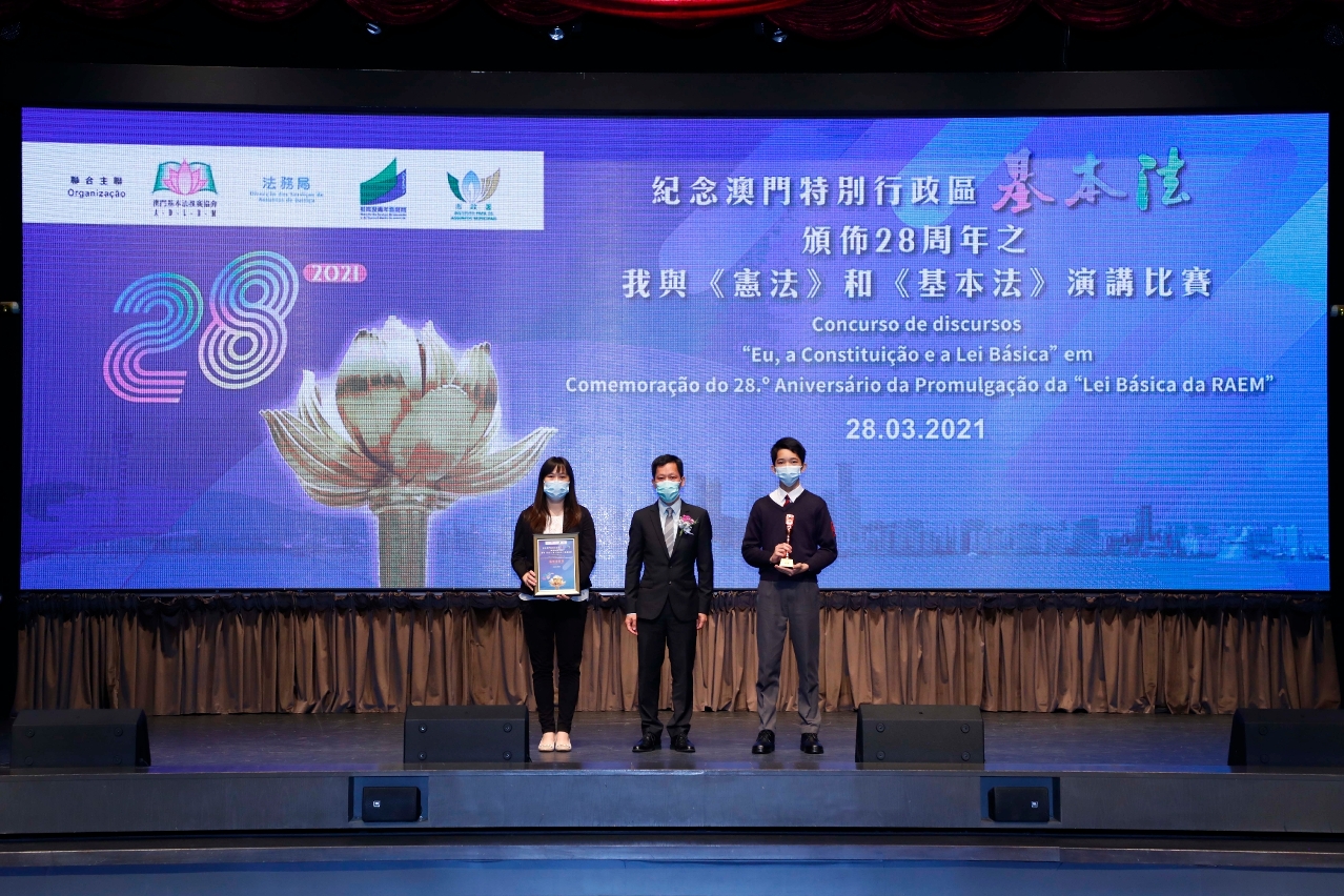 为持续向青少年推广《宪法》和《基本法》,澳门基本法推广协会、法务局、教育及青年发展局和市政署联合主办的“纪念《澳门特别行政区基本法》颁布28周年之我与《宪法》和《基本法》演讲比赛”决赛已于3月28日在圣保禄学校礼堂顺利举行。