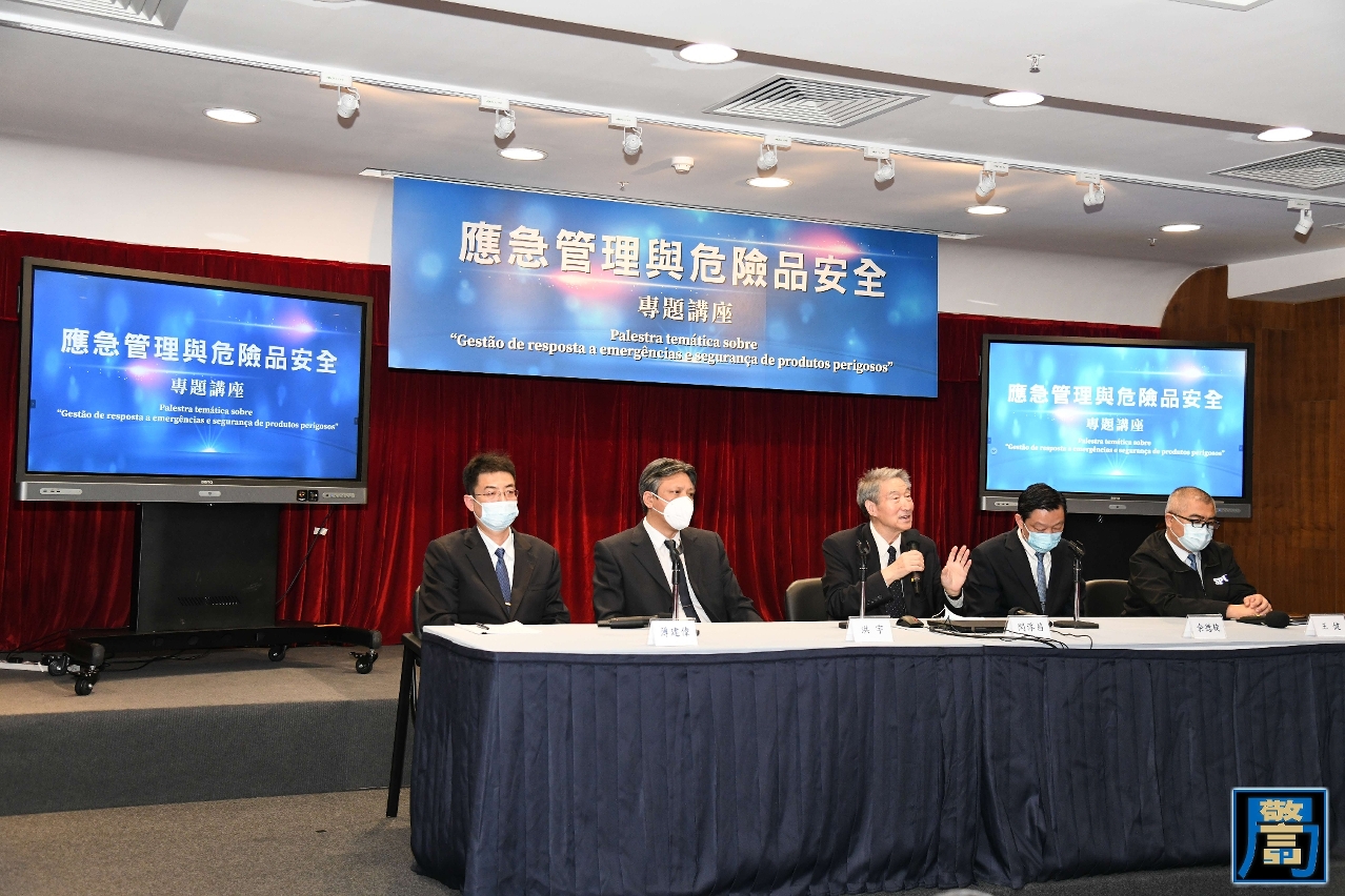 保安当局为更有效推进新《民防法律制度》对澳门特区的民防运作模式所开展的重大革新,以及《危险品监管法律制度》的制定工作,于2021年3月31日,在治安警察局出入境事务大楼礼堂举行“应急管理与危险品安全专题讲座”,邀请国家应急管理部消防救援局局长琼色率领有关专家及高层管理人员来澳担任主讲嘉宾。特区政府保安司司长黄少泽联同警察总局局长梁文昌,与逾百名来自保安范畴部门、民防架构成员、社团和相关业界代表出席是次专题讲座。