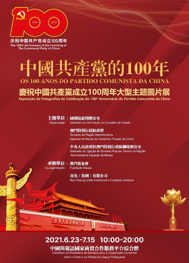 由国务院新闻办公室、澳门特别行政区政府、中央人民政府驻澳门特别行政区联络办公室主办,澳门基金会、南光(集团)有限公司承办的“中国共产党的100年——庆祝中国共产党成立100周年大型主题图片展”,将于6月23日上午在中国与葡语国家商贸合作服务平台综合体开展,届时邀请中央驻澳机构、特区政府相关部门、澳门社会各界代表出席开展仪式。