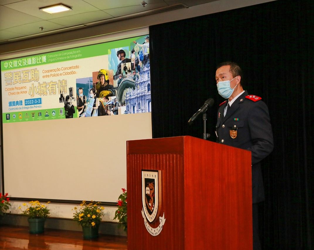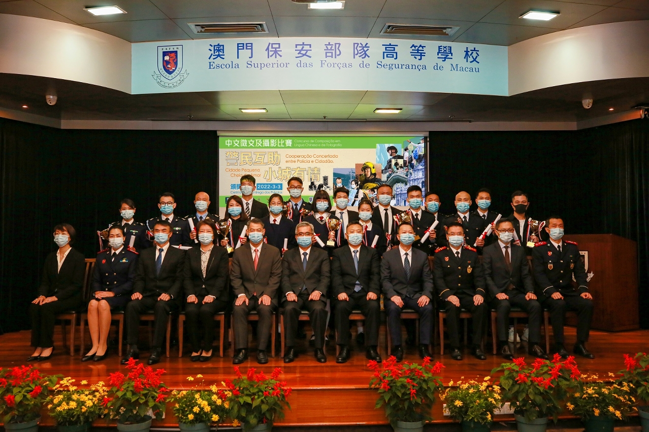 “警民互助,小城有情”中文征文及摄影比赛颁奬典礼,于本年3月3日在严格遵守卫生当局的防疫指引下,在澳门保安部队高等学校礼堂举行;典礼由保安司司长黄少泽主礼,并邀请中联办警务联络部宋东翔副部长、警察总局梁文昌局长、澳门海关黄文忠关长、保安部队及保安部门的领导、赛事评委、各奖项得奖者,以及高等院校和中学代表等嘉宾出席。