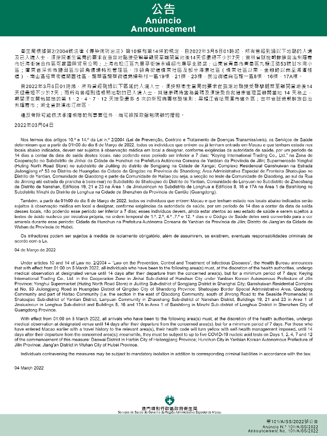 新型冠状病毒感染应变协调中心(下称应变协调中心)宣布,因应内地的疫情变化,卫生局根据第2/2004号法律《传染病防治法》第10条和第14条的规定,自2022年3月5日凌晨1时起,所有曾经到过以下地点的入境及已入境人士,须按照卫生当局的要求在指定地点接受医学观察至离开当地后14天但最短不少于7天:吉林省延边朝鲜族自治州珲春市近海街道合作区可赢国际贸易公司;上海市松江区九里亭街道永辉超市沪亭北路店;山东省青岛市黄岛区九龙江路53号甘水湾小区;广东省深圳市盐田区沙头角边境特别管理区、沙头角街道桥东社区及部分海涛社区(桥东社区以东、金融路以南至海滨栈道),南山区招商街道兰园社区,龙华区龙华街道锦绣新村一区19栋、21栋、23栋,民治街道白石龙一区8栋、16栋、17A栋。