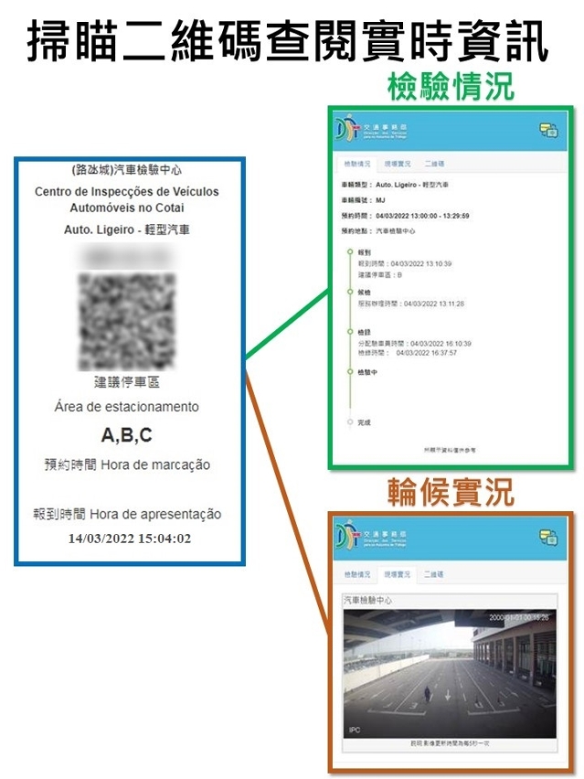 已预约验车之人士可于现场入口处报到时获取二维码凭条,可透过手机扫瞄二维码查阅验车实时资讯和整个验车流程概况,现场亦已加设2个显示屏发布明细资讯。