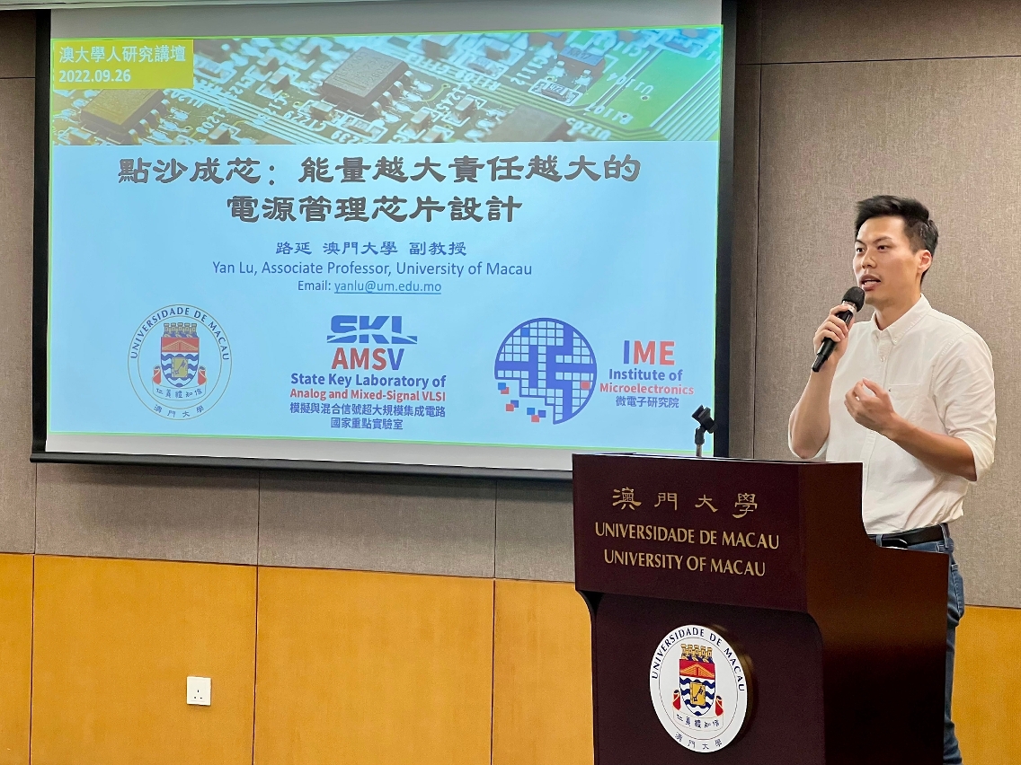 澳门大学今(26)日于大学展馆演讲厅举行“澳大学人研究讲坛”第7讲,由微电子研究院副教授路延以“点沙成芯:能量越大责任越大的电源管理芯片设计”为题发表演说,让观众瞭解一粒沙如何变成影响日常生活方方面面的芯片。现场座无虚席,反响热烈,亦有中学师生透过视讯在线参与。