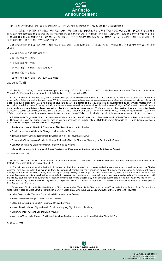 新型冠状病毒感染应变协调中心(下称应变协调中心)宣布,因应内地的疫情变化,卫生局根据第2/2004号法律《传染病防治法》第10条和第14条的规定,自2022年11月1日凌晨1时起,新增或取消对曾到内地相关区域人士的防疫措施: