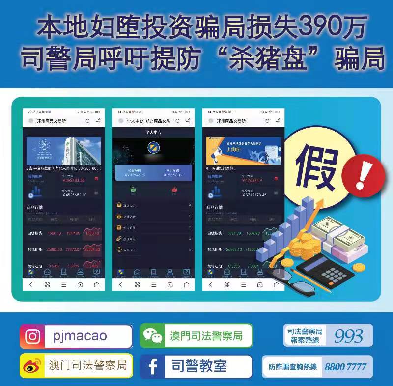 司法警察局于今日接获举报,指有市民透过K歌聊天软件认识到一名自称“国家军人团长”的人士,事主在对方多次教导下进行网上投资,最终发现无法提现始知被骗,报称损失约390万澳门元。
