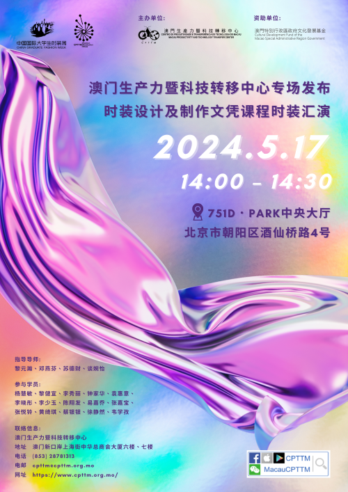 澳门生产力暨科技转移中心将带领15位时装设计及制作文凭课程优秀学员,于5月15日至20日参加在北京举行的2024中国国际大学生时装周,期望与内地服装院校及同业间加强交流合作,以及进一步向内地业界及公众推广澳门原创设计服装。