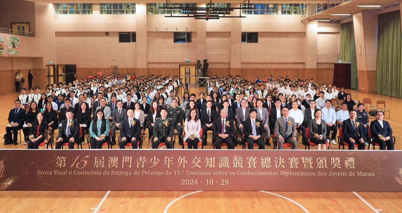 适逢中华人民共和国成立75周年、澳门特别行政区成立25周年,由澳门特别行政区政府与中华人民共和国外交部驻澳门特别行政区特派员公署主办、教育及青年发展局承办的第15届澳门青少年外交知识竞赛总决赛暨颁奖礼于10月29日成功举行。竞赛综合考验参赛学生对习近平外交思想、中国特色大国外交、涉澳外交、外交史、外交常识、时政热点等的掌握和运用,得到特区社会各界广泛支持。本届参与的学校共37所,学生人数达 9,000人,由推广赛、初赛到脱颖而出进入总决赛的8支队伍,经过一轮紧张的外交知识较量,最终获得冠军的是教业中学,亚军、季军和殿军的队伍分别是镜平学校、劳校中学、濠江中学,获优异奖的是:澳门大学附属应用学校、圣保禄学校、圣公会(澳门)蔡高中学、澳门坊众学校。