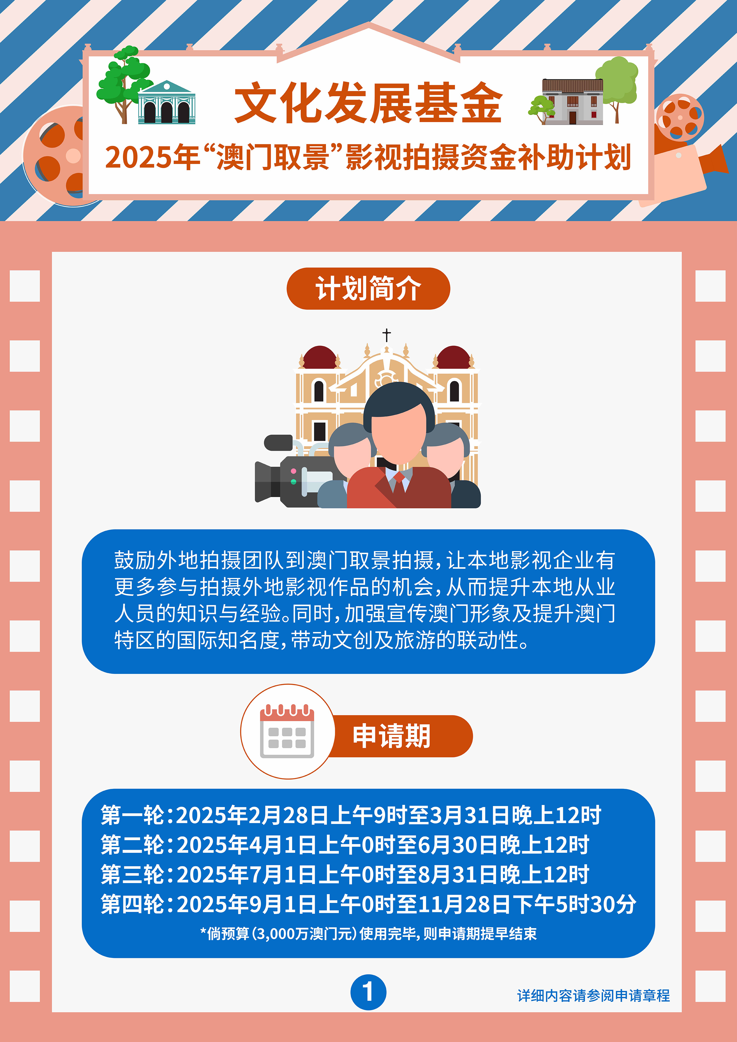 今年将推出四轮申请,第一轮申请期由2025年2月28日至3月31日,倘预算使用完毕,则申请期提早结束。资助计划接受在确认提交申请日前尚未开展在澳门取景拍摄工作,且在澳拍摄的日数不少于3天的外地影视项目,由外地拍摄团队主导并来澳参与拍摄工作。资助申请须由作为澳门制片单位的澳门商业企业主提出,其所营事业须与影视制作相关。获资助的影视项目须在资助期内完成公开播放,且公映版本的片长及片中出现澳门取景地点的时长,须符合章程规定的时限要求。