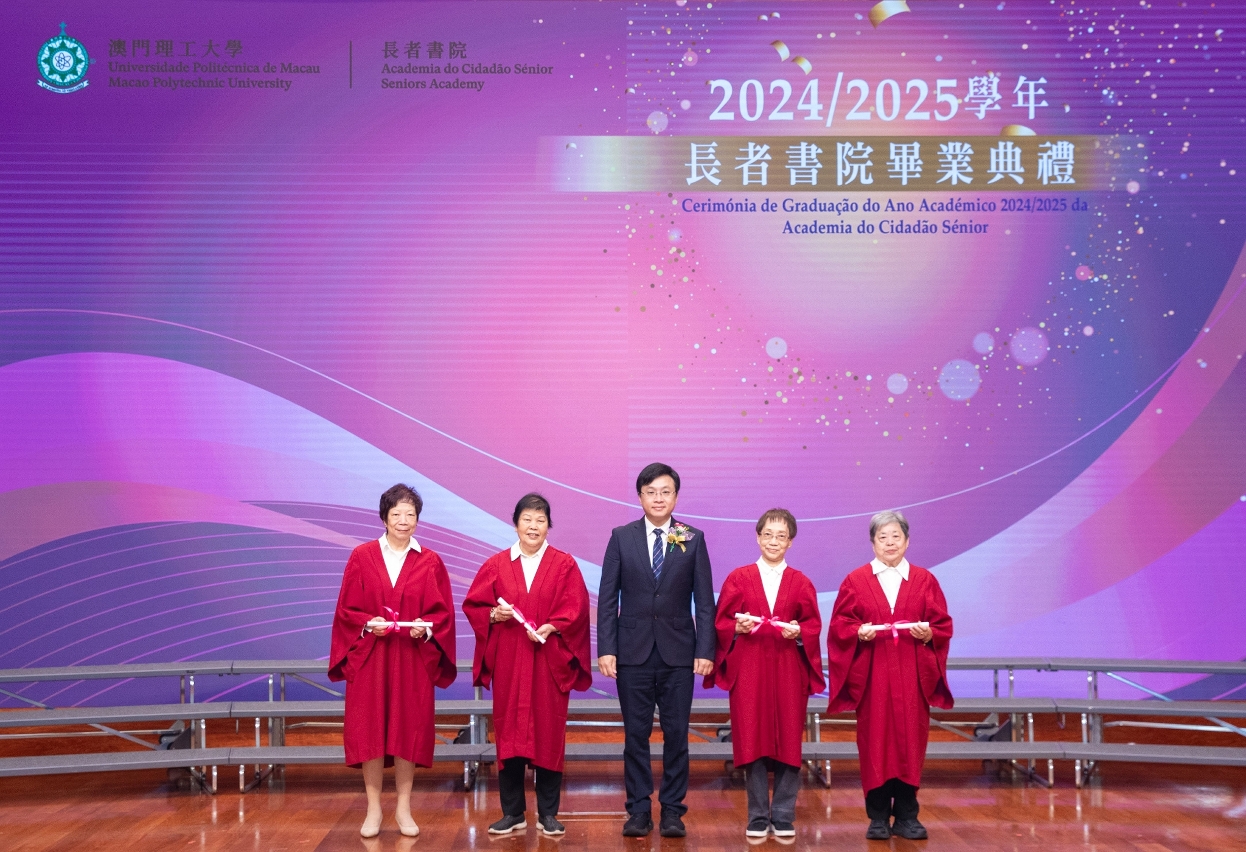 澳门理工大学长者书院毕业典礼由澳门理工大学校长严肇基、澳门特区政府社会工作局代局长许华宝、澳门明爱服务总监袁志海,以及长者书院代院长邓晓霞主礼。严肇基祝贺学员们学有所成,同时表示,作为澳门第一所高等教育机构专为长者而开设的教学单位,澳门理工大学长者书院实践持续教育的理念,具有26年办学经验,透过开办各类课程支持长者持续学习。为配合特区政府支持居民持续进修的施政方针,新学年长者书院继续在电脑、语言、文化、艺术、健康等领域开办课程。