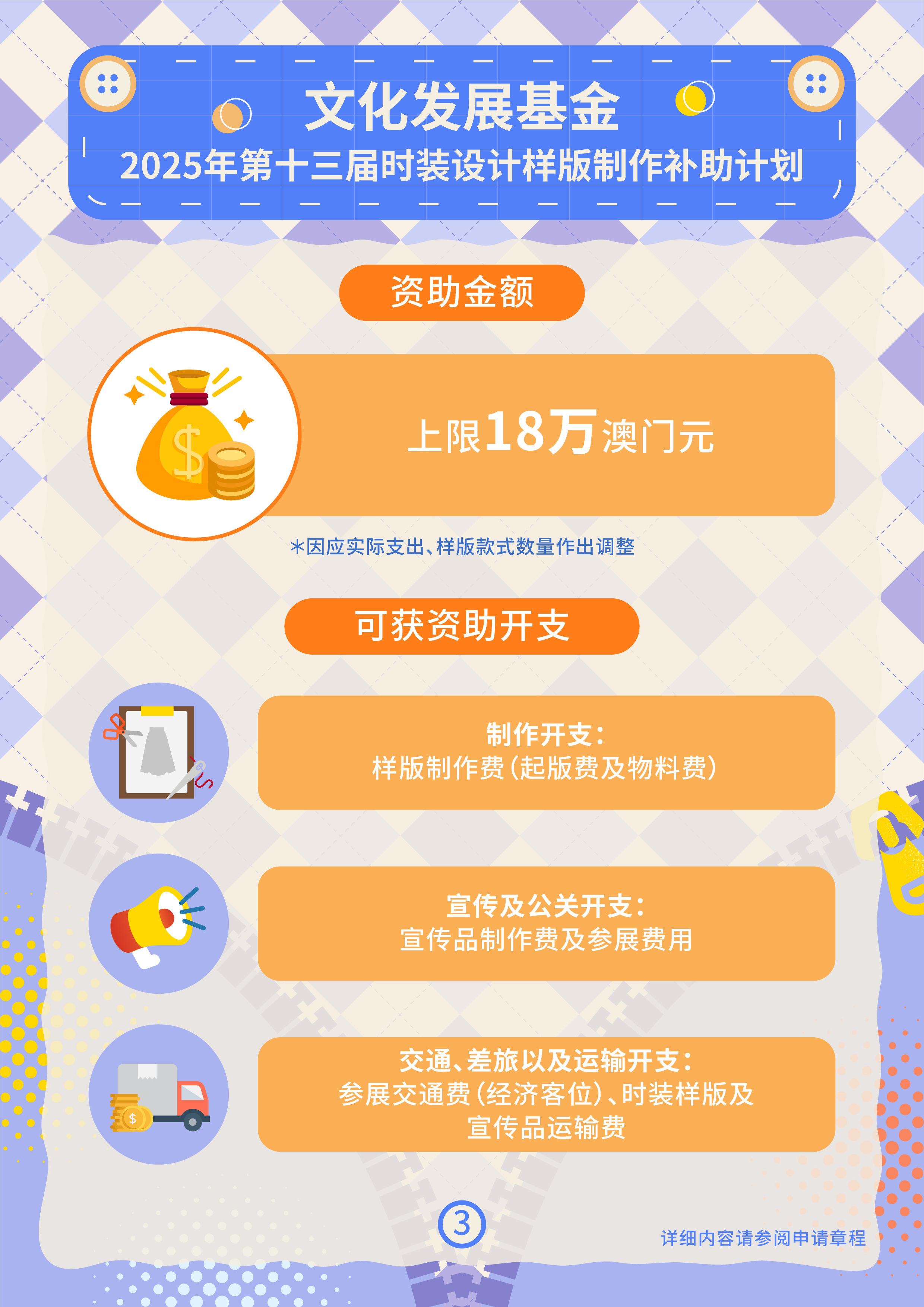 文化发展基金将于6月24日至8月1日接受“第十三届时装设计样版制作补助计划”的申请,为本地时装设计师的原创时装系列作品的样版制作及宣传推广提供支持,持续推进澳门时装设计行业发展。