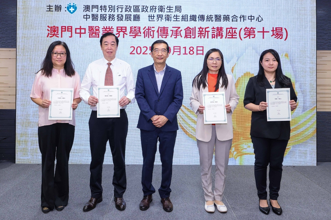 卫生局中医服务发展厅和世界卫生组织传统医药合作中心(澳门)日前共同举办第10场“澳门中医业界学术传承创新讲座”,邀请龚栋森、张用爱、何展云和蔡通4位具丰富经验的本地中医作为主讲嘉宾,与中医业界交流从业心得和分享临床经验。卫生局郑成业副局长和世界卫生组织传统医药合作中心(澳门)莫蕙主任出席并主持活动。